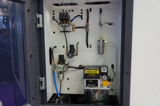 На станок устанавливается импульсная система смазки модели Versa III компании Bijur Delimon International - одного из крупнейших в мире производителей смазочных систем. Контролируется системой ЧПУ. Возможность настраивать интервал и длительность работы. Кнопка ручного включения насоса смазки на корпусе. Оснащена манометром для контроля уровня давления масла. Трубки подачи смазки подведены ко всем направляющим и опорам ШВП для равномерного смазывания движущихся частей станка во время работы.Шнековый транспортер для удаления стружки