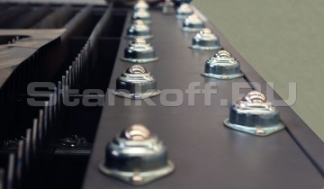 Направляющие и косозубые рейки станка закрыты гофрозащитными кожухами с металлическими накладками. Обычно используется только тканевая гофра, которая со временем прогорает и перестает выполнять грязезащитную функцию. Металлические накладки служат для предотвращения попадания окалины, искр, стружки на тканевую основу. Благодаря этому металлическому панцирю многократно увеличивается срок службы гофрированных кожухов.Литой алюминиевый портал