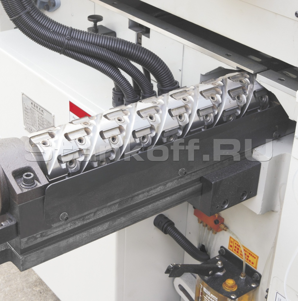 Привод подающего транспортера, приводных роликов в столе и подающих роликов перед верхним ножевым валом осуществляется посредством массивной цепи от отдельного двигателя и имеет плавную регулировку скорости подачи инвертором.АВТОМАТИЧЕСКАЯ СИСТЕМА СМАЗКИ