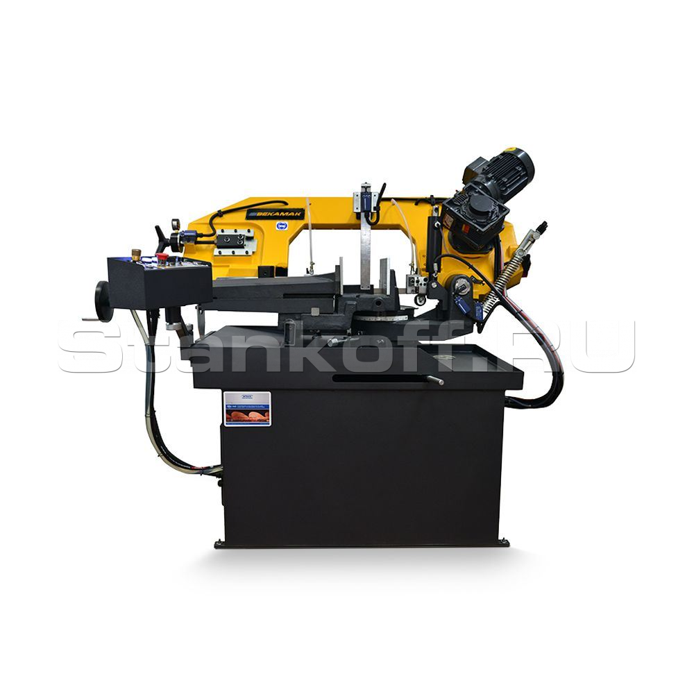 Подходит как для нарезки пакета заготовок, так и профилей большого размера. Станок имеет поворотную раму в две стороны и способен резать заготовки под углами 0°, +15°, +30°, +45°, +60°, -15°, -30°, -45°. Рабочие перемещения пильной рамы вниз и вверх происходят посредством гидроцилиндра, управляемым с пульта оператора.