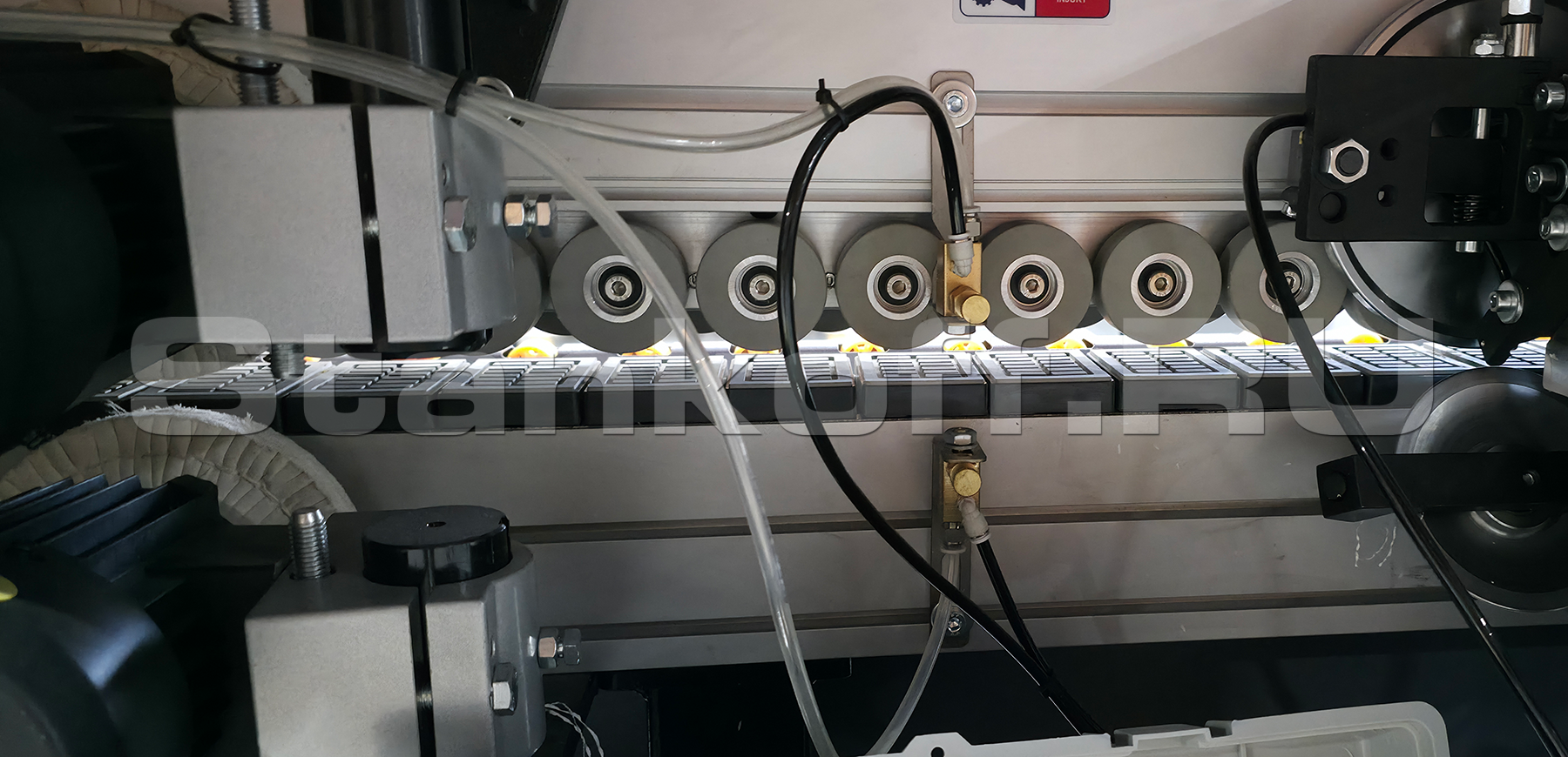 Прижимная балка и транспортные цепи обеспечивают надежное удержание панели в процессе облицовки кромки.Прифуговка