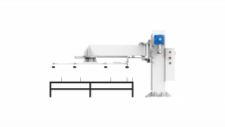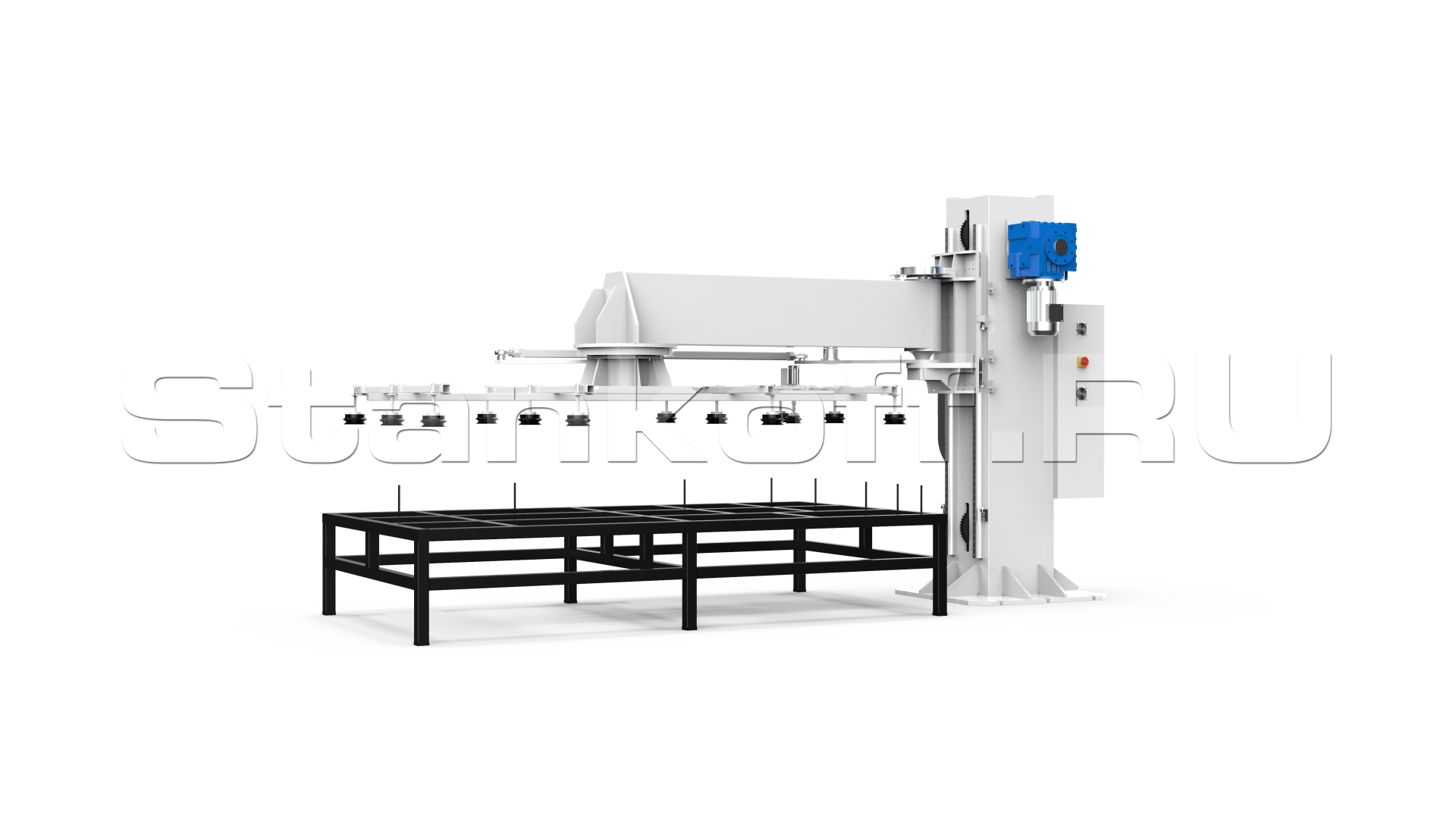 Механизм погрузки выступает за опору, обеспечивая удобный доступ к рабочей зоне и гибкость в настройке положения подачи материала.Вакуумный захват листа
