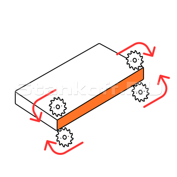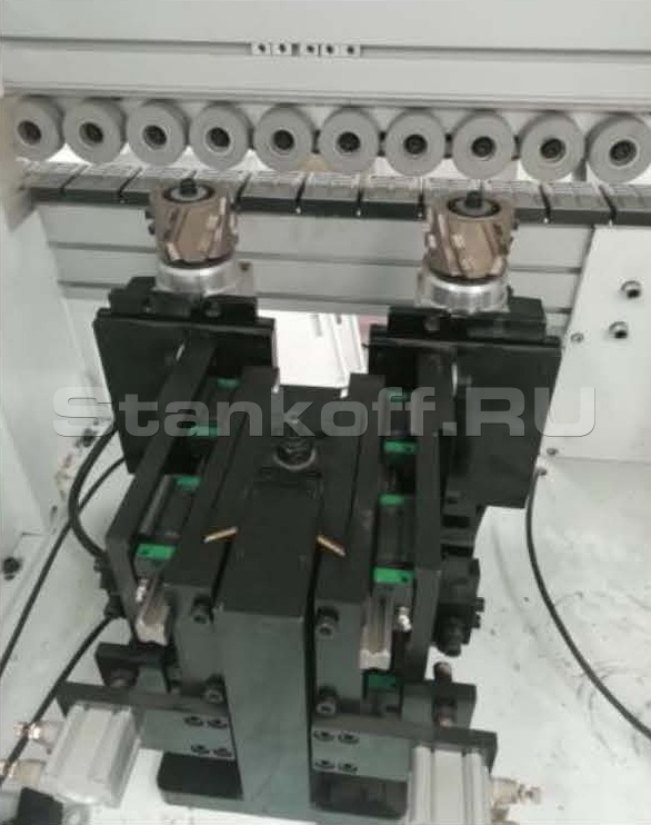Узел грубого снятия свесов удаляет избыточный кромочный материал с верхней и нижней сторон обрабатываемой панели. Узел необходим для первоначального формирования края и устранения основного избытка материала.Узел обкатки углов