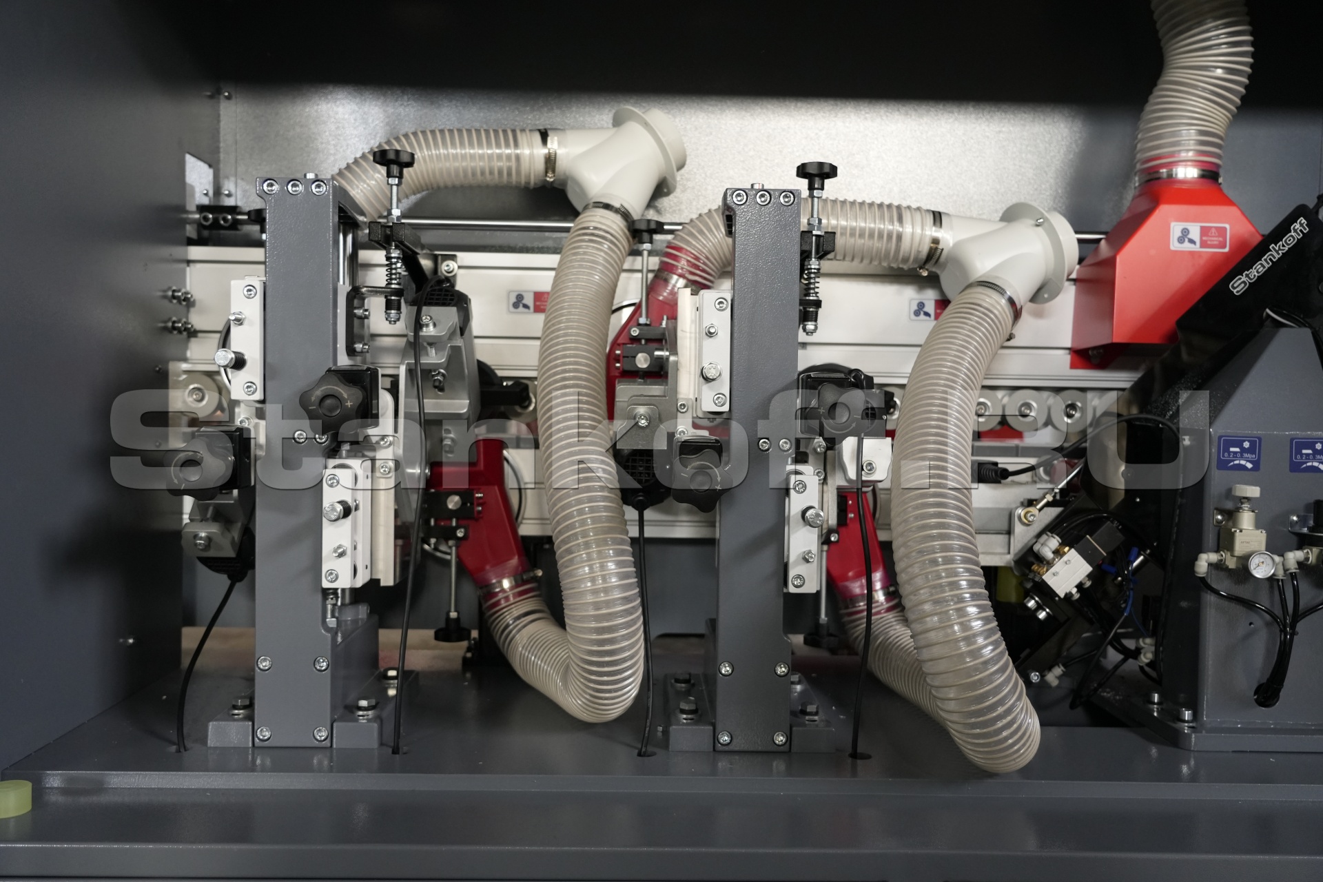 Узел предварительного фрезерования панели способен удалять кромку панели, позволяя устранять дефекты, возникающие в результате пиления, и корректировать ошибки, вызванные неправильной настройкой пильного диска. Узел защищён красным защитным кожухом, что обеспечивает безопасность работы и повышает эффективность сбора пыли.Клеевой узел
