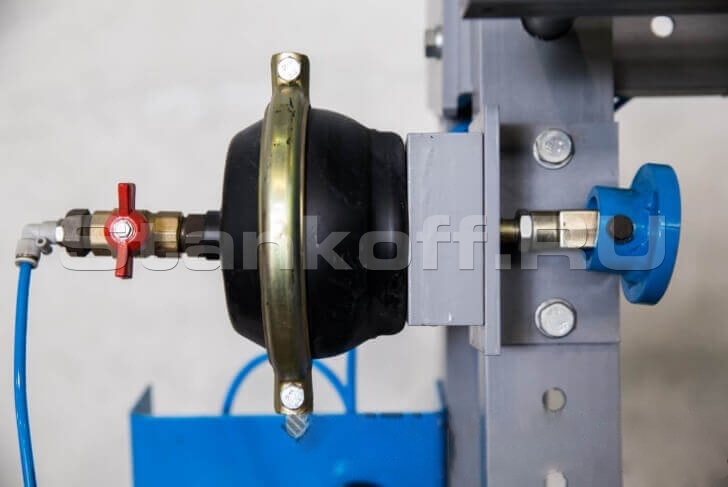 Нижние опорные пятки фрезерованы, что обеспечивает угол 90°, кроме того предусмотрена возможность компенсационной регулировки угла. Пятки переставляются с шагом 50мм.Кнопочный пневмораспределитель