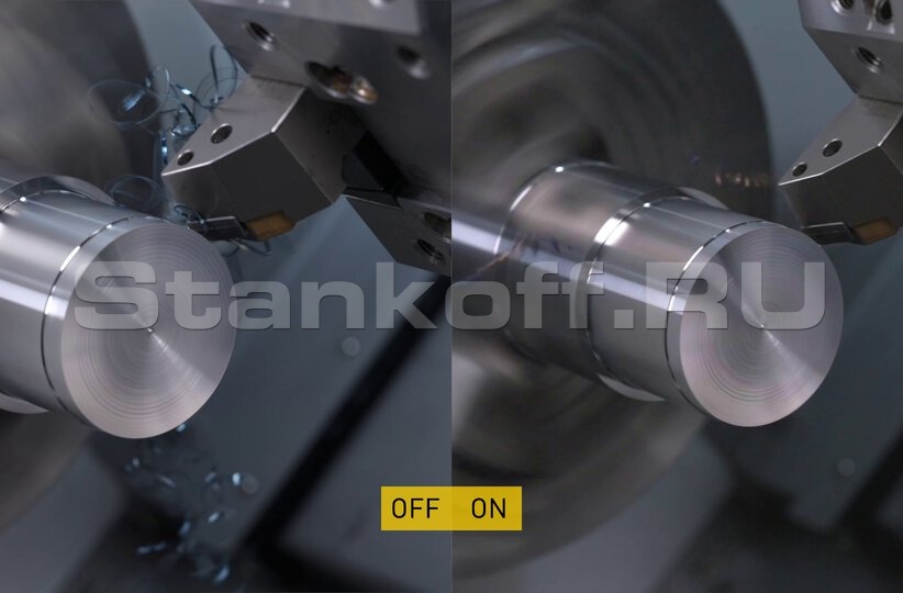 Сжатый воздух подается через сопла в зону патрона на кулачки. Это способствует удалению налипшей стружки на кулачках для сокращения времени установки новой детали и уменьшает шанс попадания стружки в шпиндель, а также облегчает работу пруткоподатчика.Функция дробления стружки Fanuc
