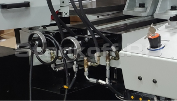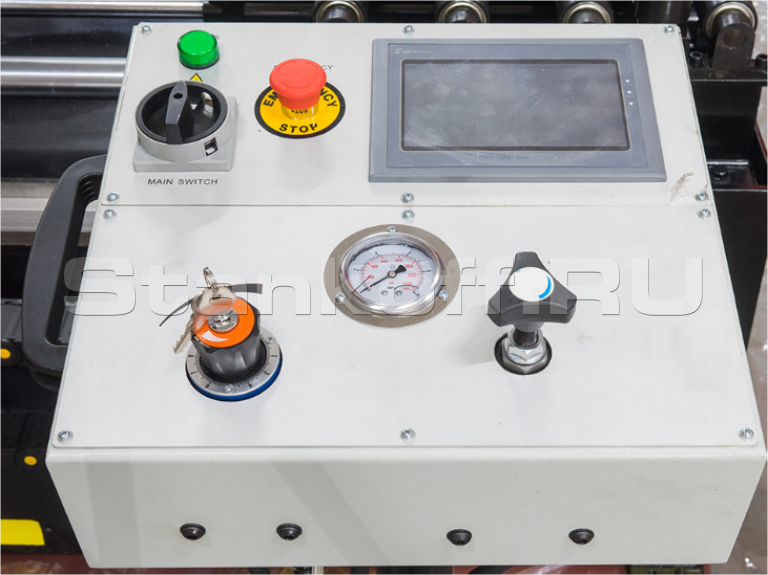 Выведена консолью к станку, для удобства оператора. Длина подачи заготовки контролируется автоматически c ЧПУ (СNC). ЧПУ станка строится на PLC контроллере. Сенсорный дисплей управления.Механическое натяжение полотна