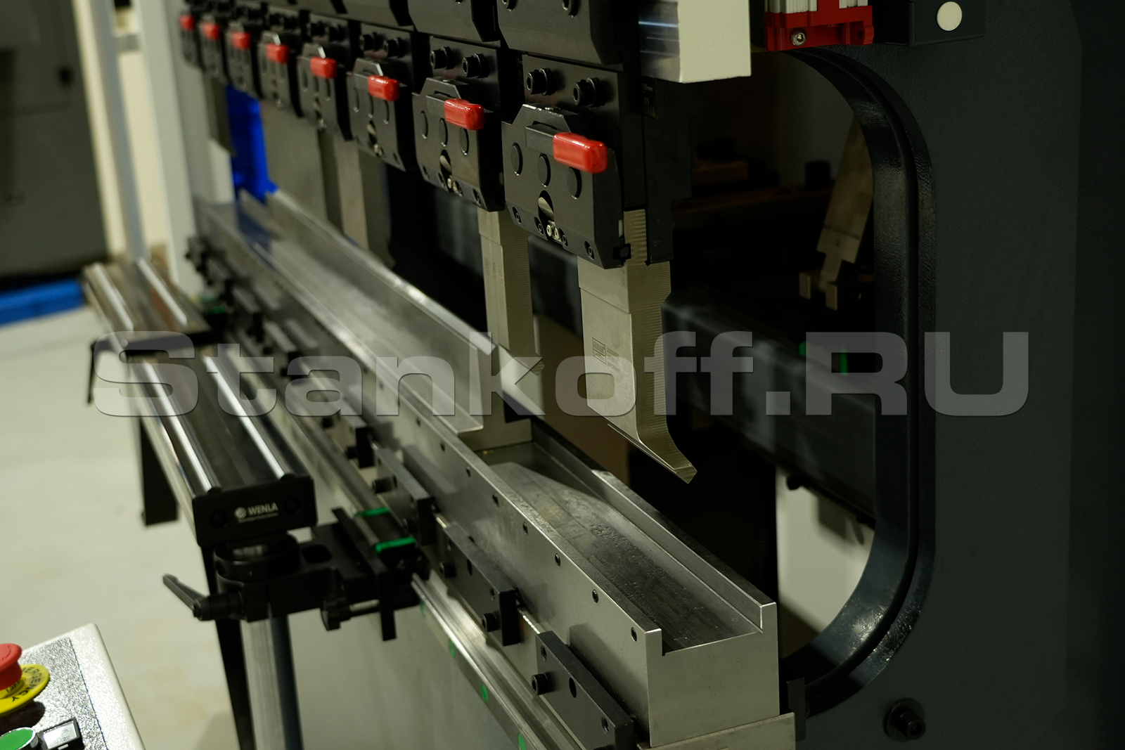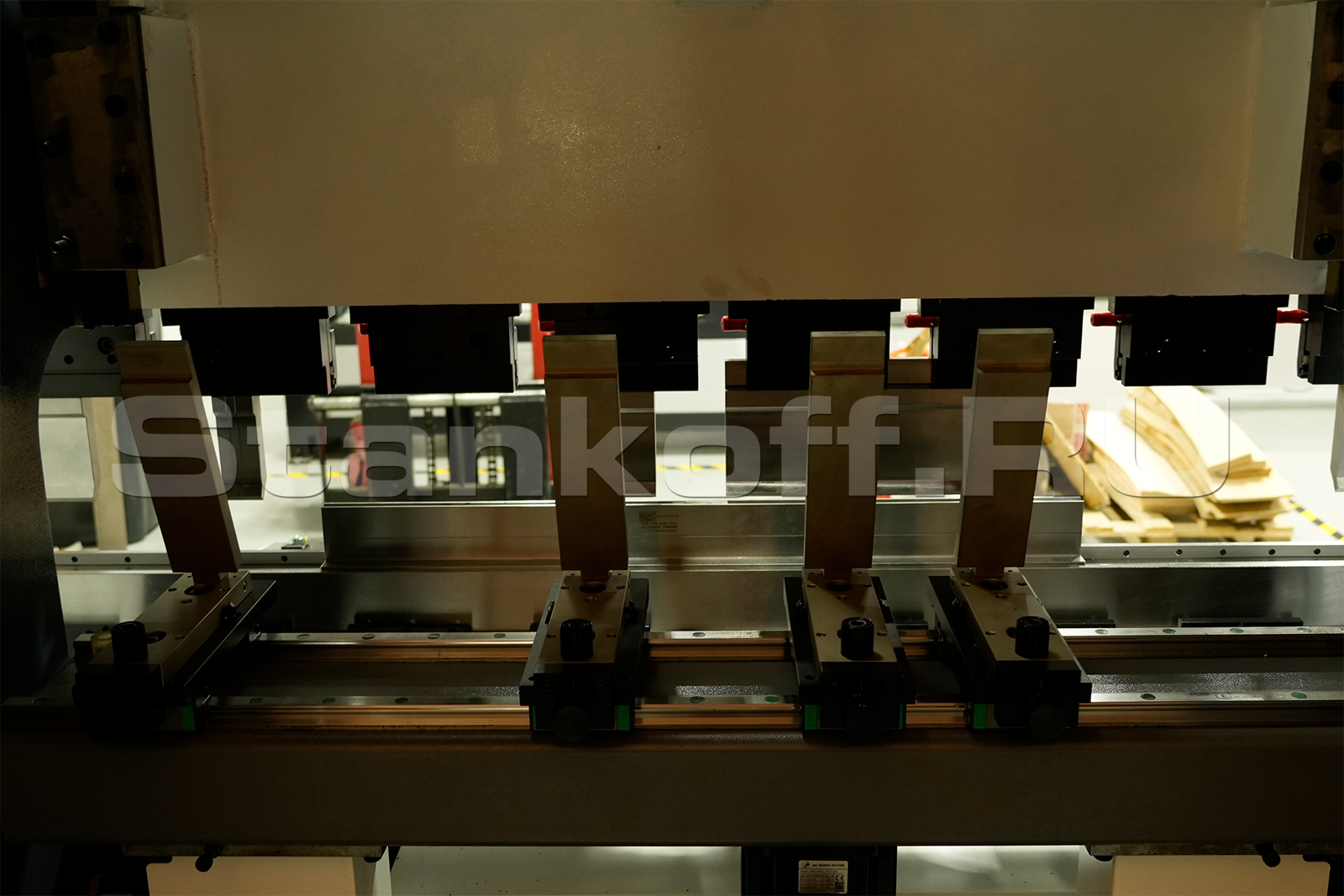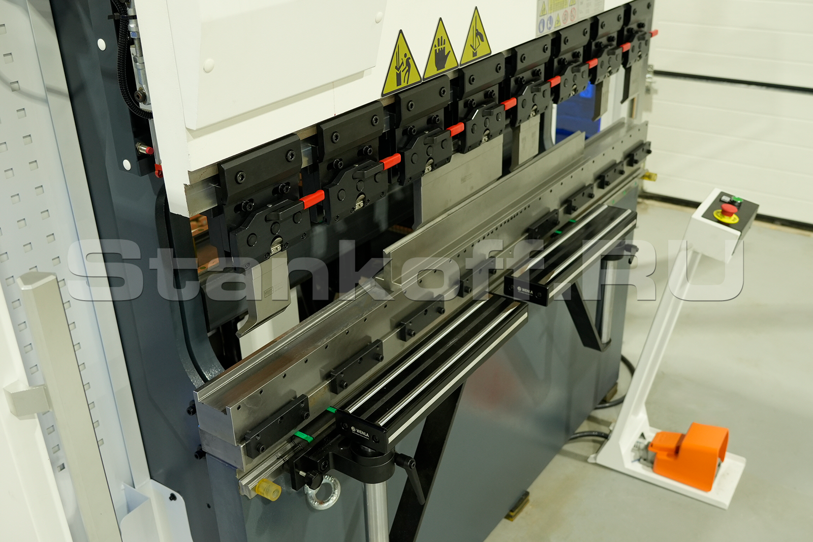 Система DSP генерирует видимую лазерную защиту, соответствующую нормам EN12622. Лазерный луч защищает оператора пресс-тормоза от опасности быть зажатым между верхним и нижним инструментом.
