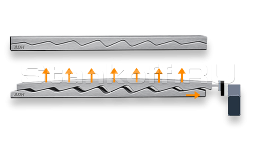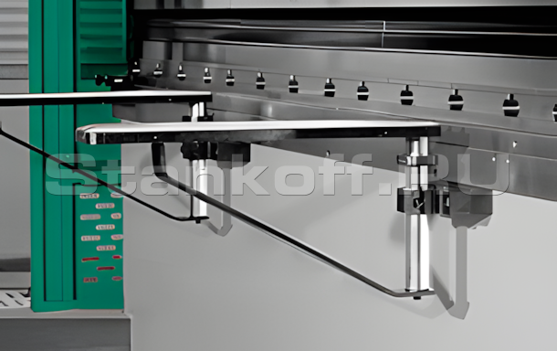 Система компенсации прогиба обеспечивает компенсацию прогиба по всей длине матрицы. Механическая система состоит из определенного количества (зависит от длины рабочего стола) парных клиньев, каждая пара работает в разных сечениях, имеет свою величину компенсации, отличную от остальных, таким образом, достигаются превосходные результаты гибки.Главный двигатель