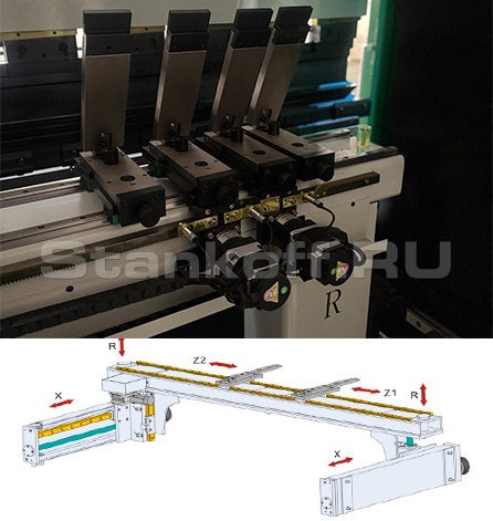 Стандартный задний упор имеет программируемую ось X, R, а также оси Z1, Z2, управляемые со стойки управления аварийной остановки. Это позволяет настраивает упоры по глубине(Х) и высоте (R), а также перемещать пальцевые блоки влево и вправо (Z1, Z2).Быстросъемный зажим