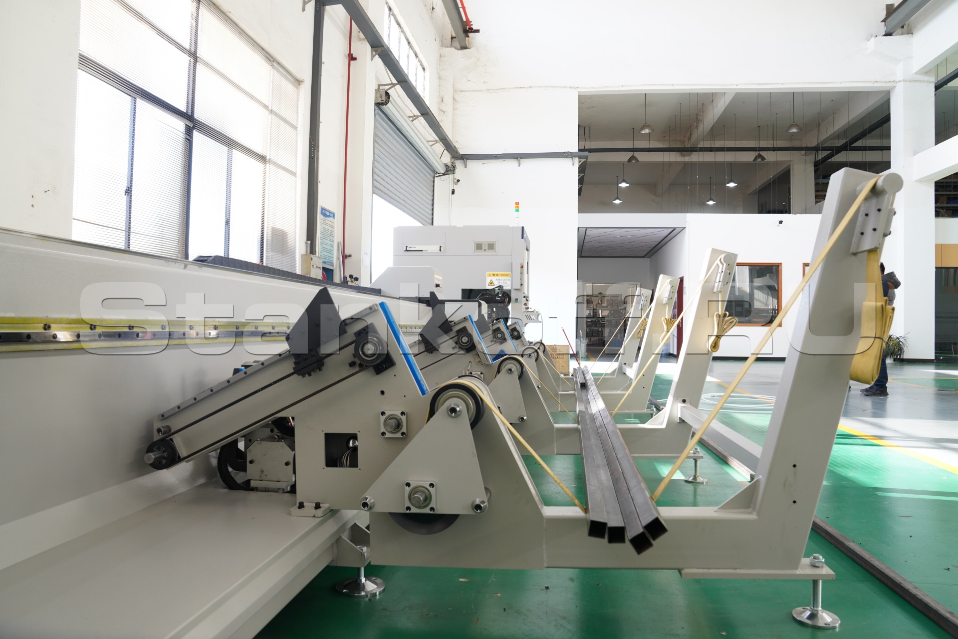 Полуавтоматическая система погрузки ленточного типа интегрирована в станину станка и обеспечивает подачу обрабатываемых труб в зону резки. Ленточная погрузка управляется с использованием ЧПУ, позволяя удалённо контролировать и настраивать параметры системы погрузки. Максимальный вес пачки труб составляет 2 тонны. Одновременно в систему погрузки можно загрузить от 7 до 9 квадратных труб размером 160x160. Вес одной трубы должен быть не более 100 кг, а её длина – не менее 3500 мм. Время загрузки первой трубы составляет 30 секунд, а последующие 20 секунд. Общая длина системы погрузки составляет 6300 мм.Автоматические поддерживающие ролики