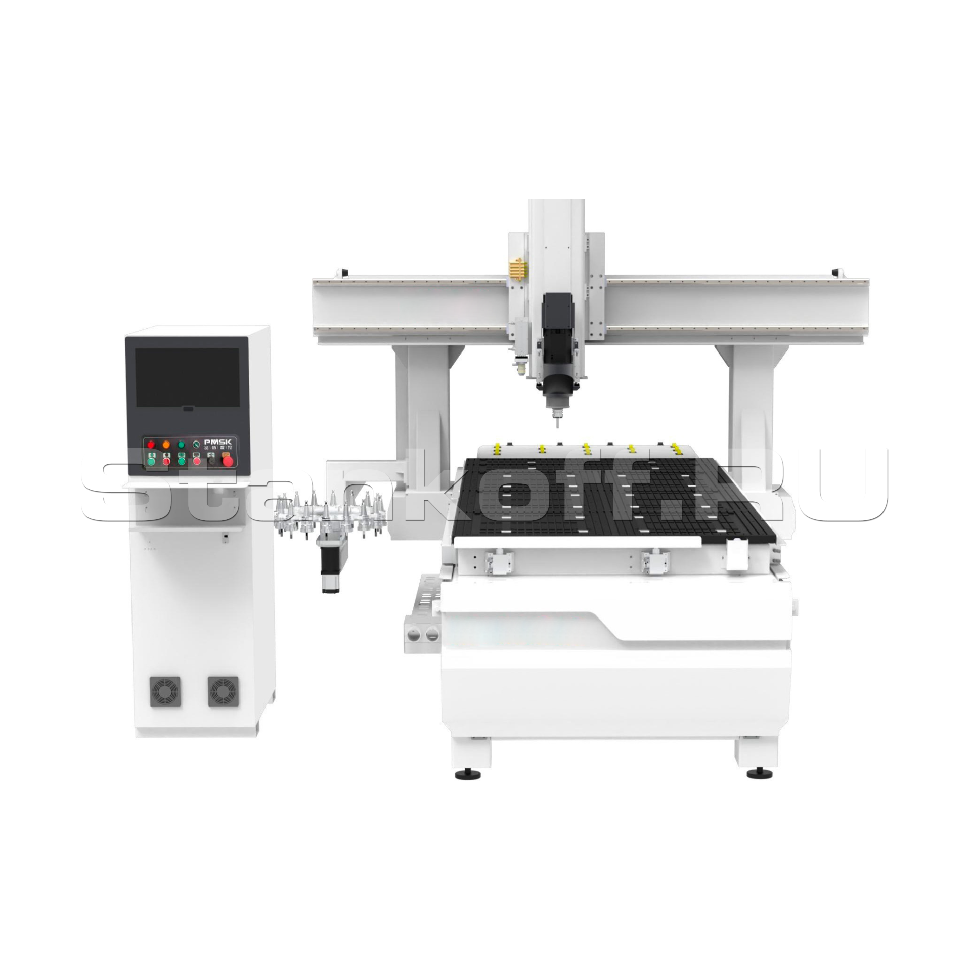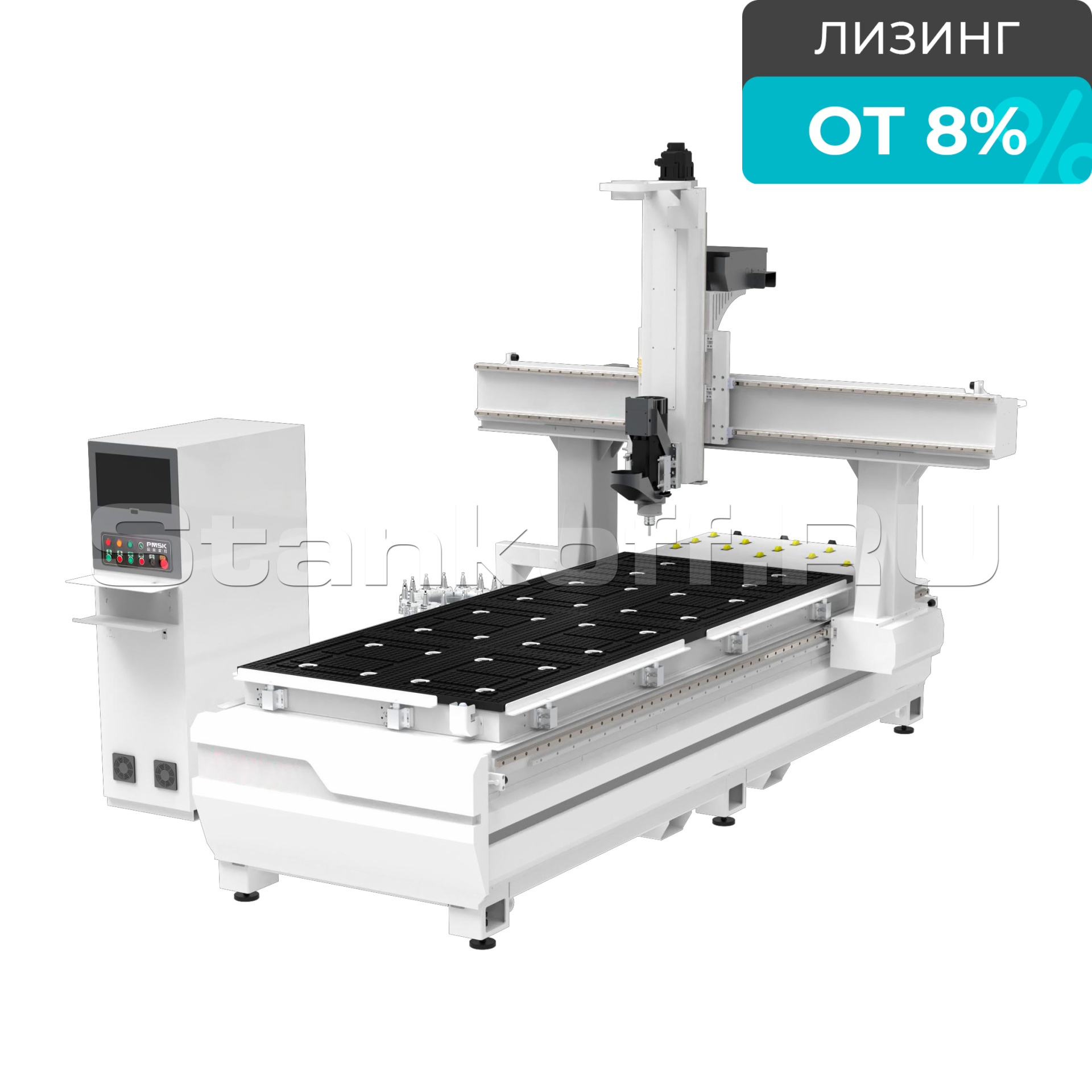 4-х осевой фрезерный станок с ЧПУ с автоматической сменой инструмента ST2030A9 Rotary оснащен вертикальным шпинделем мощностью 9 кВт с автоматической сменой инструмента, дисковым магазином на 16 инструментов с сервоприводом и многосекционным вакуумным столом. Шпиндель поддерживает вертикальную, горизонтальную и угловую (90°) обработку, что обеспечивает широкие технологические возможности. Команды управления осуществляются G-кодом.