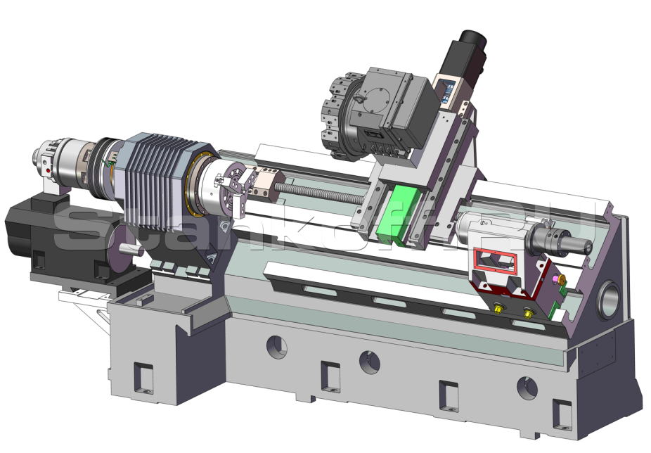 Литая станина с углом наклона 45° градусов, которая имеет низкий центр тяжести, что обеспечивает дополнительную виброустойчивость и точность при обработке. Широкий контакт шпиндельной бабки и станины препятствует возникновению вибраций при точении, обеспечивает максимальную стабильность при высокопроизводительной обработке, а также увеличивает срок эксплуатации станка.Шпиндель