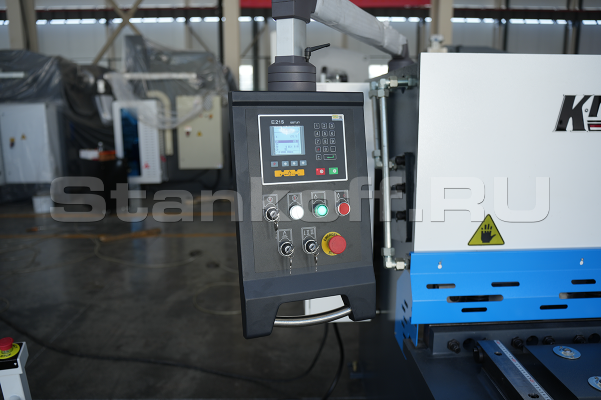 Реализует строго вертикальное (прямолинейное) перемещение ножевой балки, что упрощает конструкцию и снижает затраты на механизм резки. При этом ключевые параметры процесса — угол атаки (скоса) и зазор между ножами — регулируются индивидуально и автоматически, что расширяет диапазон применяемых материалов и повышает качество реза.Контроллер Estun E21