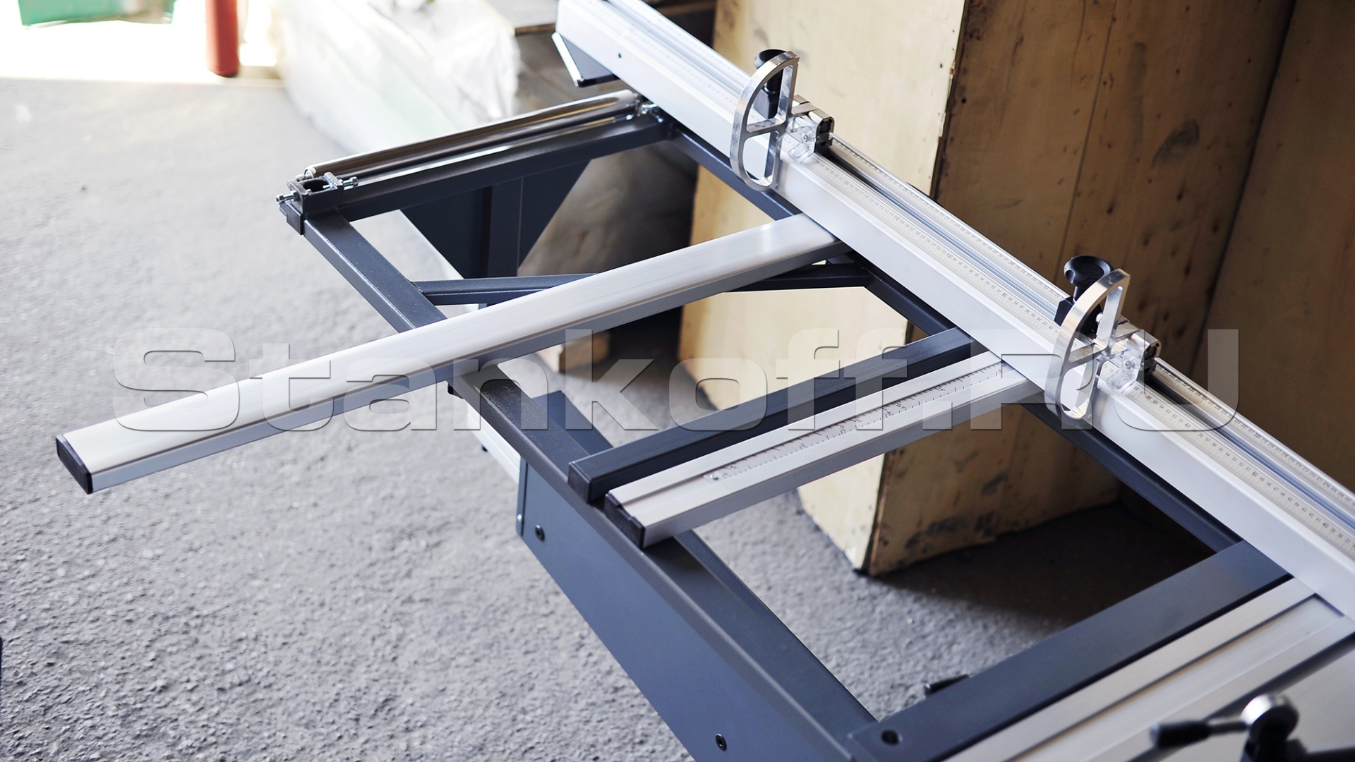 Поперечная линейка жестко фиксируется к поддерживающему столу в двух точках под углом 90 градусов к линии пропила. Настраивается единожды и не требует дополнительных регулировок. Полностью исключает смещения прямого угла.Защитный кожух