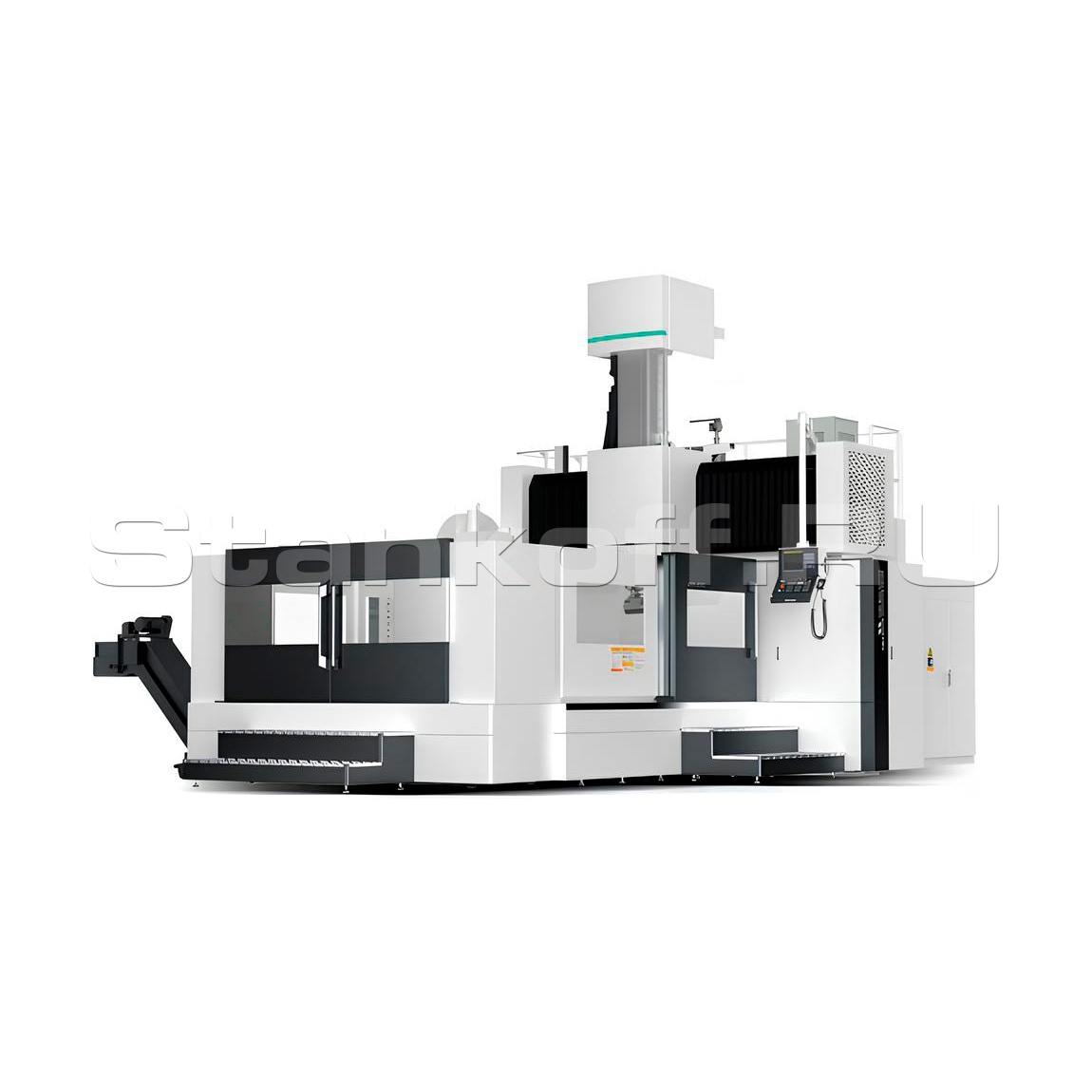 - Внешняя защита: полностью закрытая металлическая обшивка (без верхнего покрытия) предотвращает разбрызгивание стружки и охлаждающей жидкости; на портальном каркасе установлены лестницы и платформы с защитными ограждениями для обслуживания.