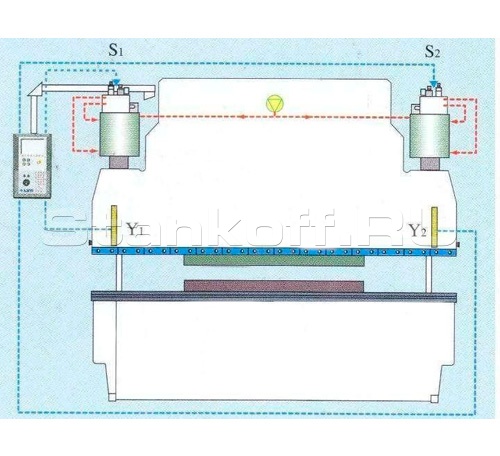 Шпиндели Y1 и Y2 представляют собой два независимых канала управления движением гидроцилиндров, регулируемых системой числового управления. С каждой стороны станка установлены решетчатые линейки Y1 и Y2, обеспечивающие точное измерение расстояния между ползуном и рабочим столом. Линейки жестко связаны с рабочим столом, что исключает влияние прогиба или деформации вертикальных стоек на положение ползуна. При перемещении ползуна данные о его положении мгновенно передаются в систему ЧПУ, которая рассчитывает управляющие сигналы для сервоклапанов S1 и S2, обеспечивая синхронную работу двух гидроцилиндров и точное соответствие движения ползуна заданным параметрам.Электрогидравлическая сервосистема