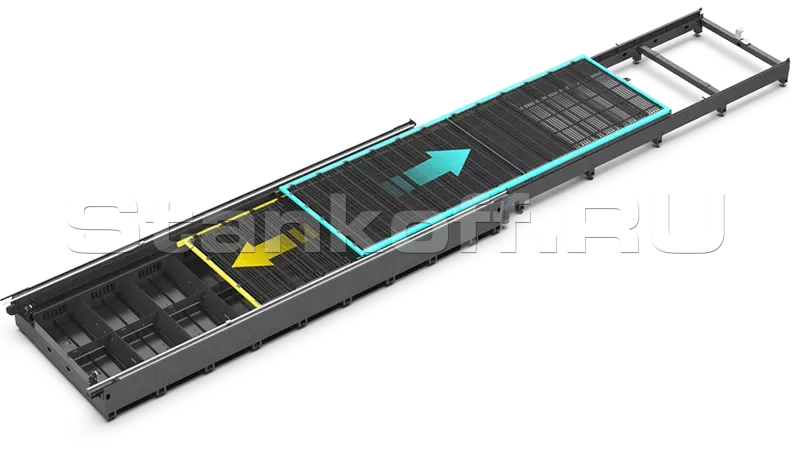 Наличие сменного стола, обеспечивает увеличение производительности в несколько раз, и позволяет выполнять резку практически без остановки. Смена происходит в автоматическом режиме. Скорость переключения паллет составляет всего 10 секунд.Автоматизированная зональная система дымоудаления
