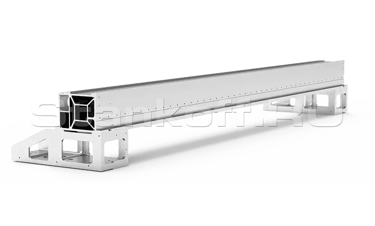 Станина сварена из высококачественной листовой стали и подвержена высокотемпературному отжигу, значительно повышающему ее прочность, твердость, износостойкость. Листовая станина обладает значительными преимуществами по сравнению с станиной из труб, такими как больший вес, прочность и надежность, отсутствие вибраций при работе и, как следствие, обеспечивает стабильный, качественный и точный рез. Конструкция поперечной балки - балки из алюминиевого профиля.Высокопрочный литой портал