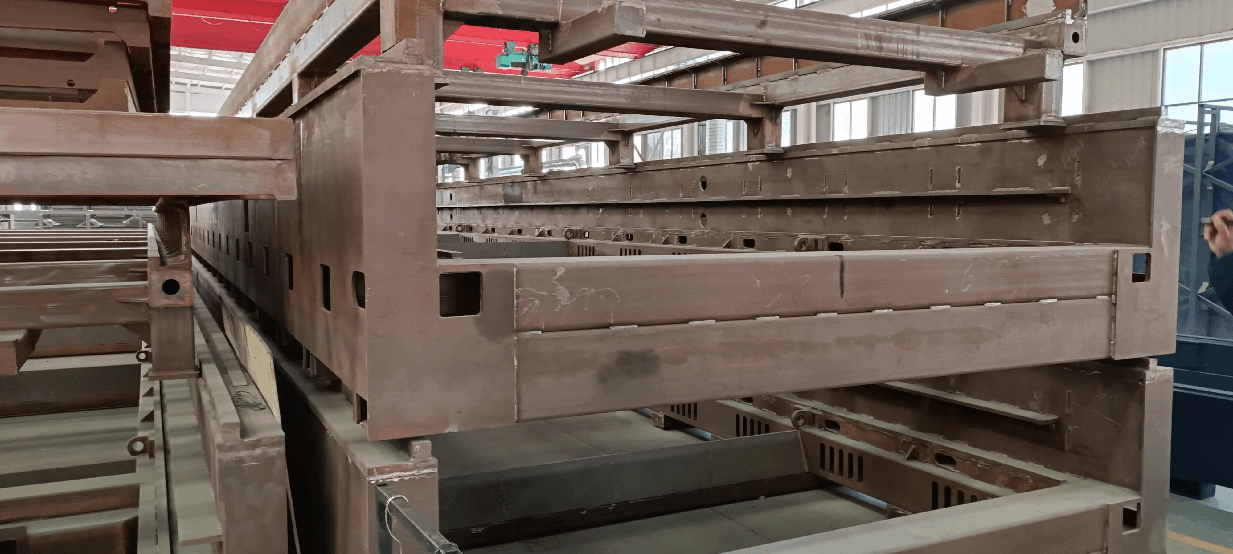 Самостоятельное производство станины позволяет заводу контролировать качество на каждом этапе, делая их станки редкостью на рынке по надёжности и стабильности. Станина выполнена из высококачественной листовой стали и проходит высокотемпературный отжиг, повышающий её прочность, твердость и износостойкость. В отличие от трубчатых конструкций, листовая станина более жёсткая, устойчивая к вибрациям и обеспечивает точный и стабильный рез. Для повышения прочности и минимизации деформаций корпус усилен ребрами жёсткости и дополнительными перекладинами. Все элементы проходят полный цикл обработки на заводе: сварку, термообработку для снятия внутренних напряжений и покраску.Стальной портал
