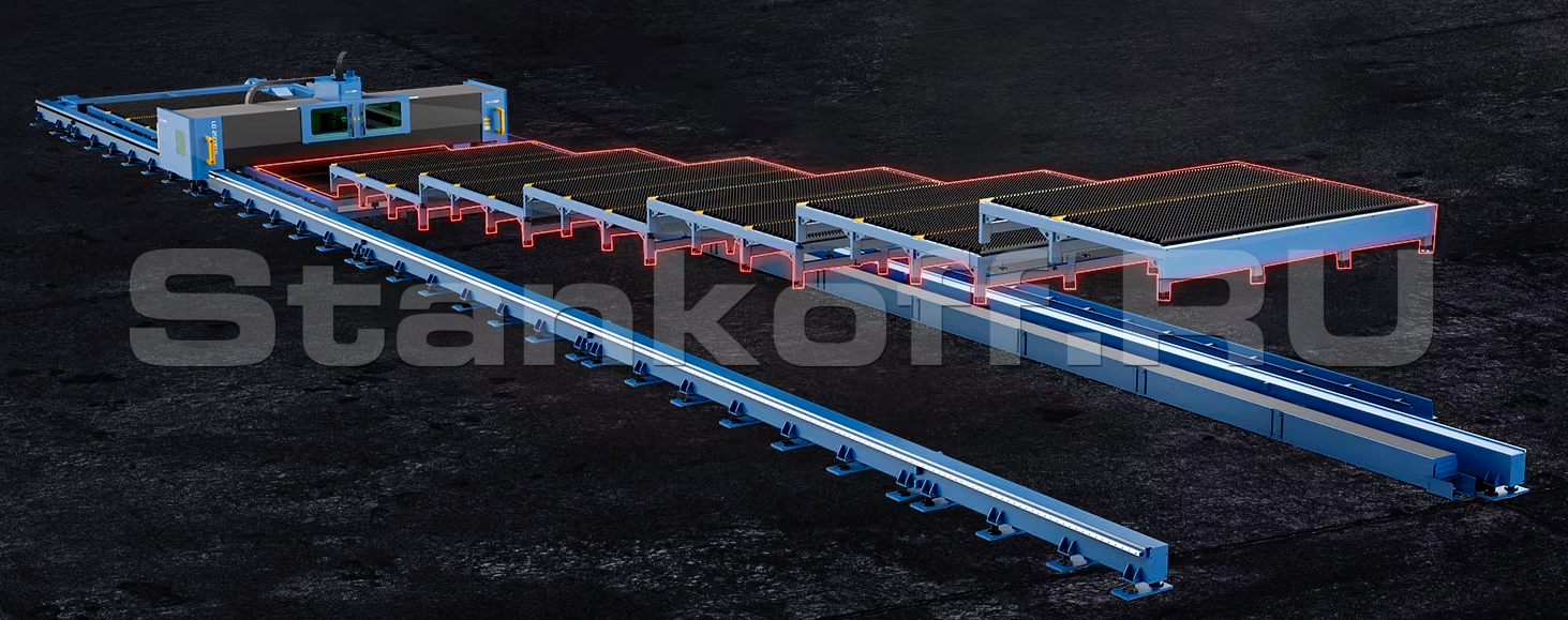 Самостоятельное производство станины позволяет заводу контролировать качество на каждом этапе, делая их станки редкостью на рынке по надёжности и стабильности. Станина выполнена из высококачественной листовой стали и проходит высокотемпературный отжиг, повышающий её прочность, твердость и износостойкость. В отличие от трубчатых конструкций, листовая станина более жёсткая, устойчивая к вибрациям и обеспечивает точный и стабильный рез. Для повышения прочности и минимизации деформаций корпус усилен ребрами жёсткости и дополнительными перекладинами. Все элементы проходят полный цикл обработки на заводе: сварку, термообработку для снятия внутренних напряжений и покраску.Стальной портал