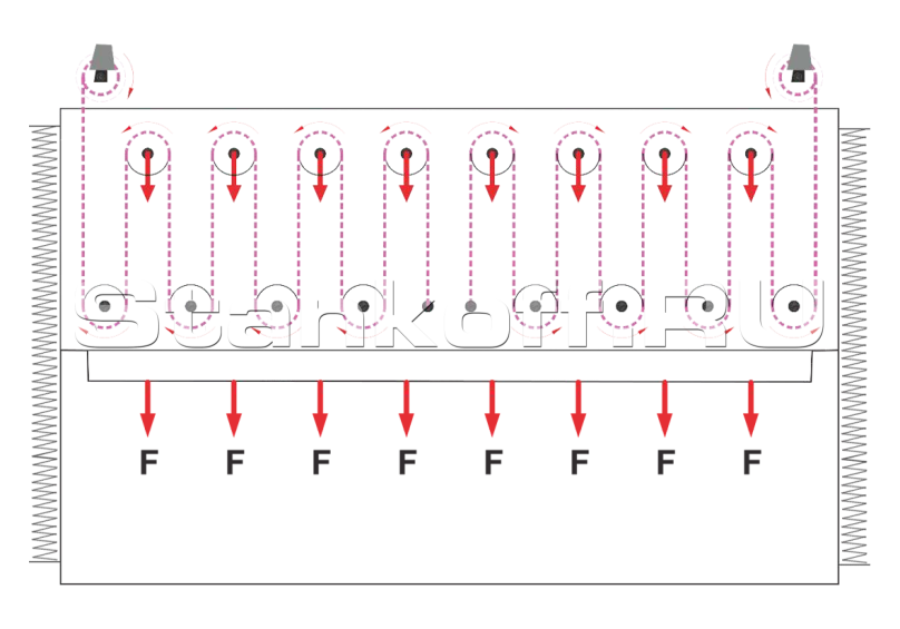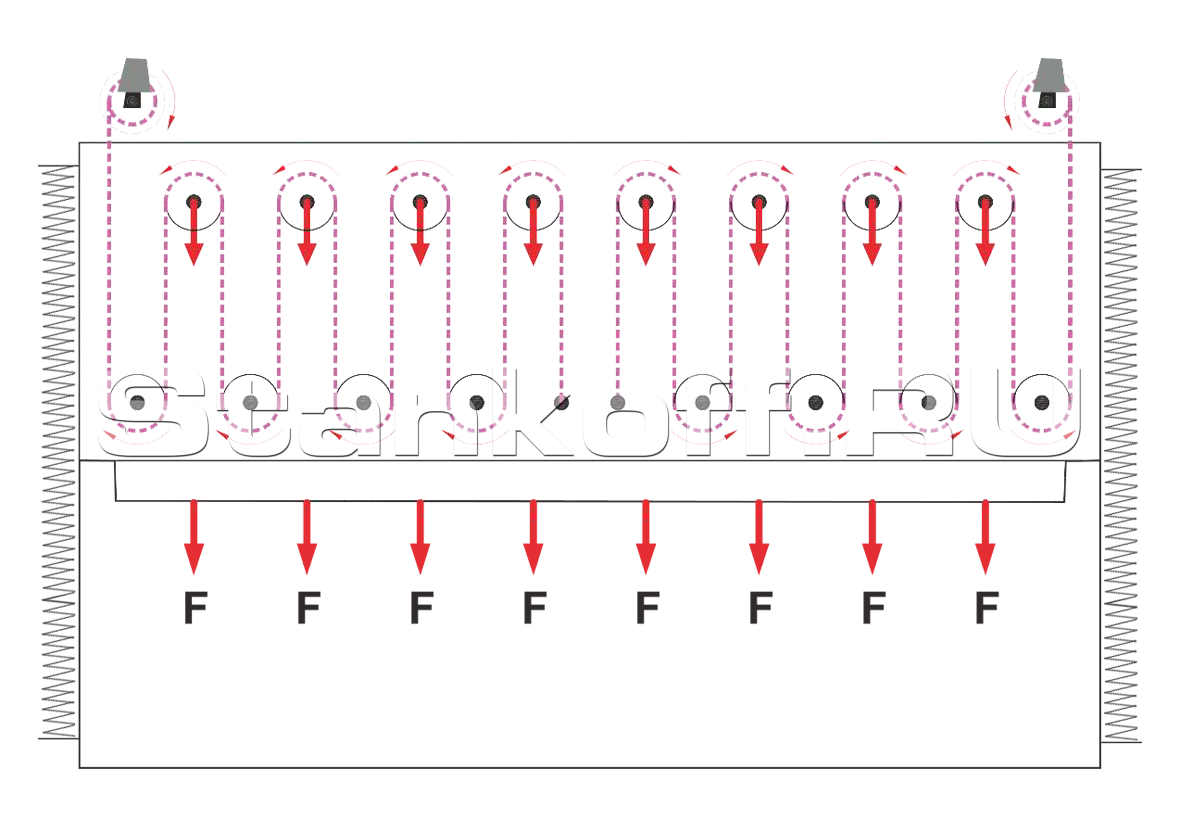 - Параллельность верхней и нижней балки обеспечивается ременным приводом;