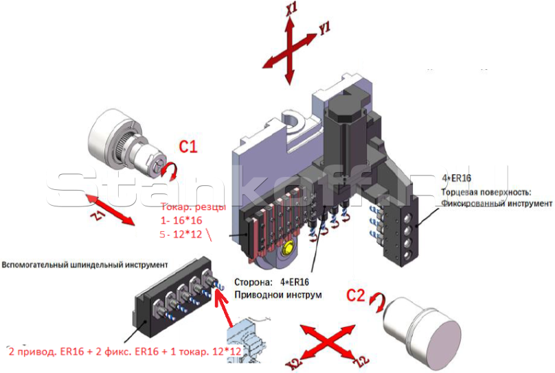 | Размер державки токарного инструмента, мм (количество позиций) | 12×12 (5 поз.), 16×16 (1 поз.) |