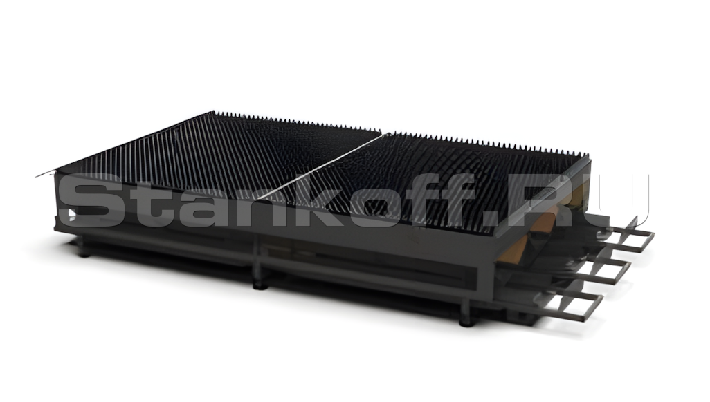 Для поддержания чистоты и экологичности производства реализована эффективная система удаления дыма с обдувом и всасыванием. Вентилятор на портале направляет дым к вытяжным отверстиям, которые автоматически открываются и закрываются вслед за движением балки, обеспечивая максимальное удаление загрязнений.Сварная станина