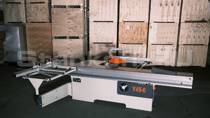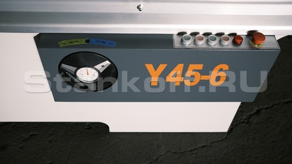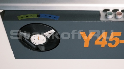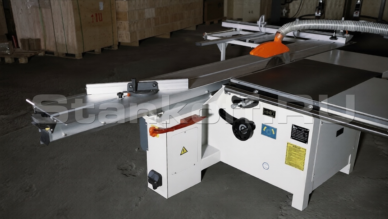 Панель управления выполнена в простом и удобном исполнении. В штурвале наклона пилы установлен индикатор часового типа для точной настройки угла. Пульт обеспечивает быстрое включение и отключение приводов, кнопки расположены эргономично, предусмотрена кнопка аварийной остановки станка.Наклон пильного узла