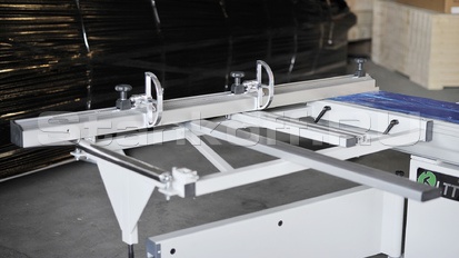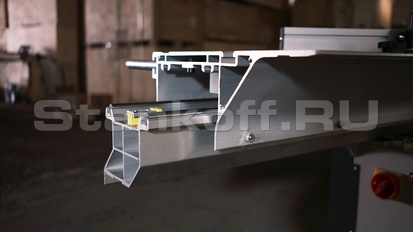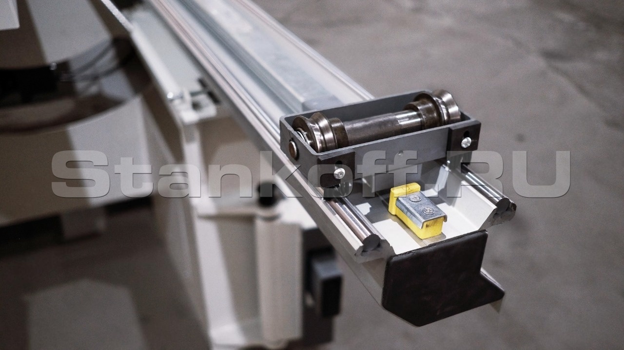 Алюминиевая каретка длиной 3200 мм и шириной 370 мм на стальных цилиндрических направляющих обеспечивает высокую точность распиловки. Роликовая система гарантирует плавное и быстрое перемещение листов большого формата, а многокамерный профиль каретки повышает жёсткость и устойчивость к скручиванию.Усиленная станина