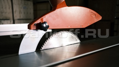 Рукоятки настройки подрезной пилы по вертикали и горизонтали удобно расположены в задней части станка. Здесь же находится маховик настройки основной пилы по высоте.Линейка