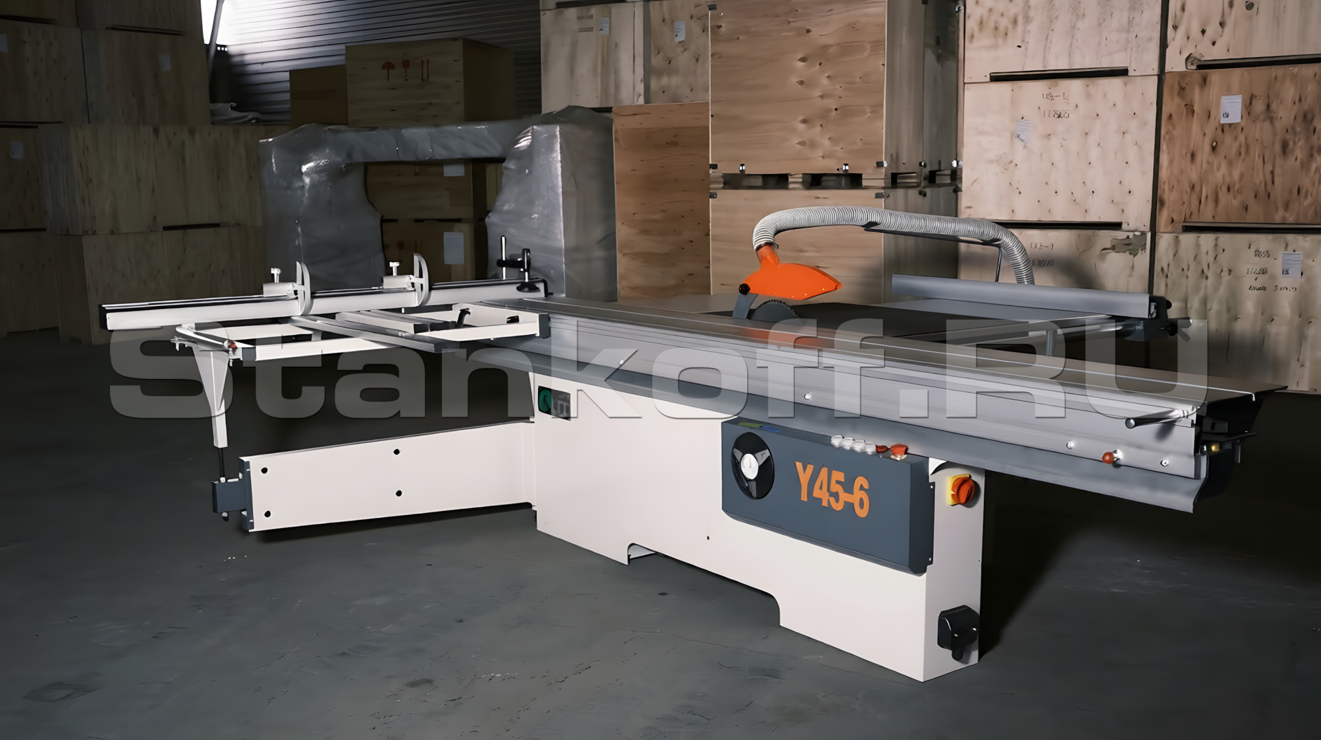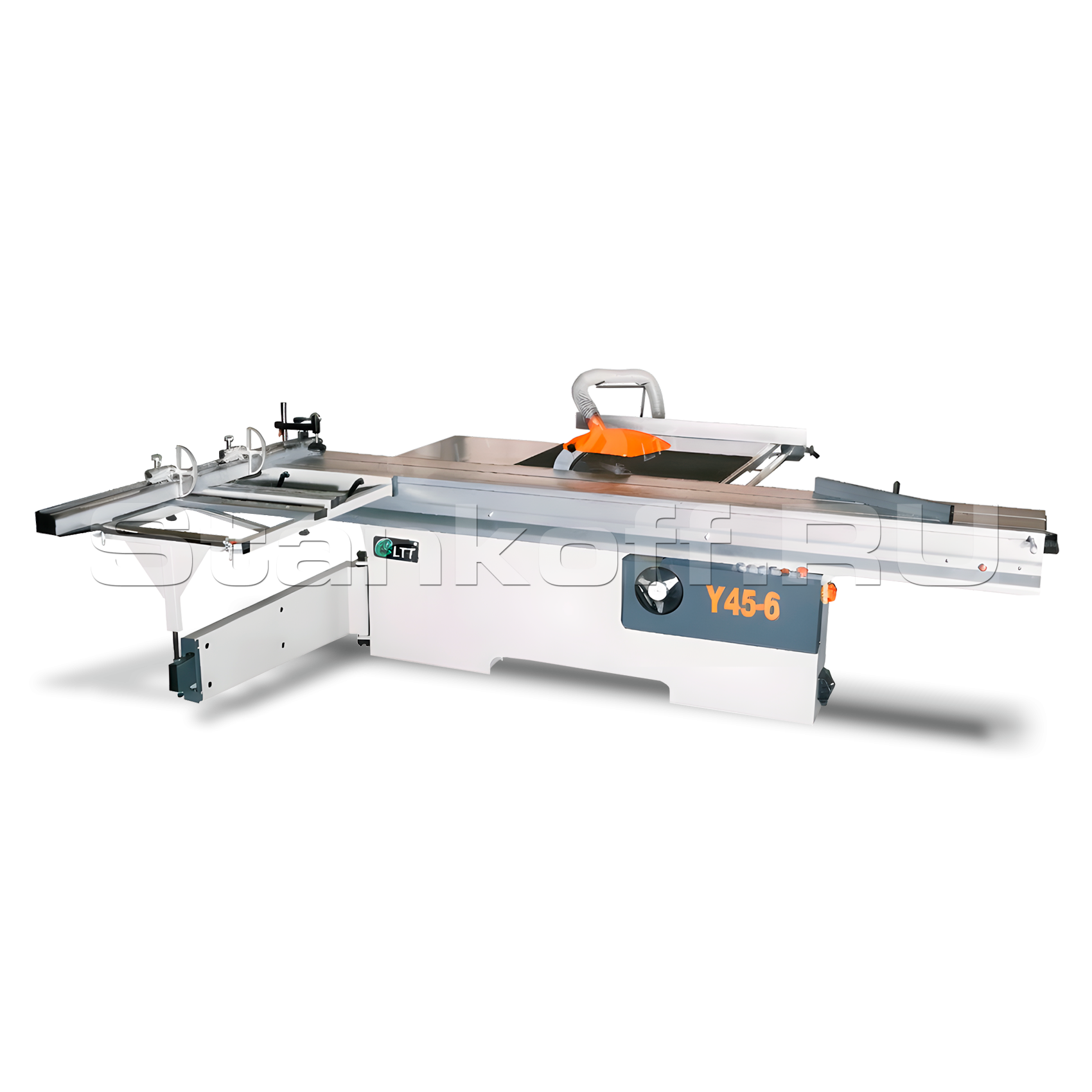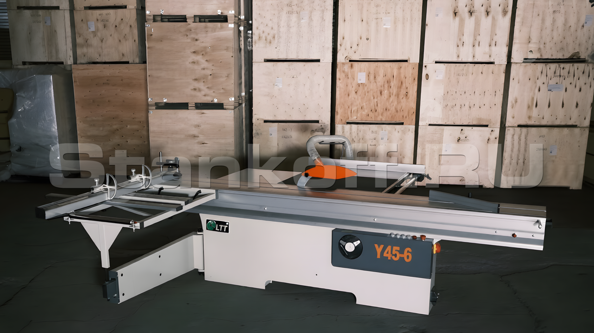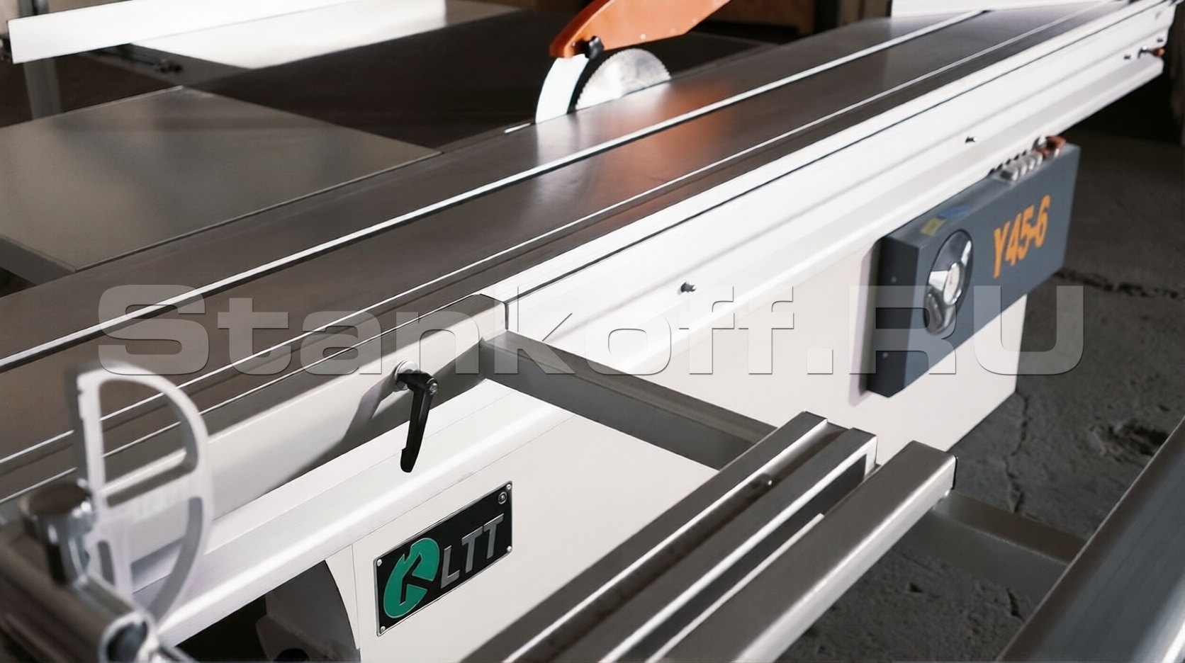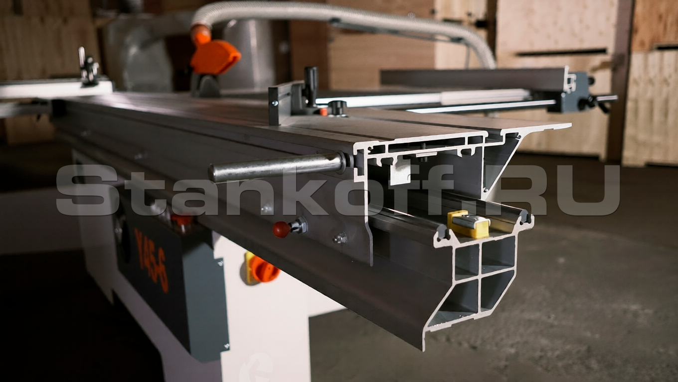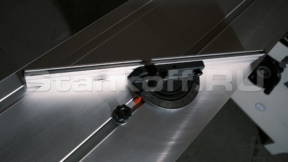 Станок оснащён механизмом наклона пильного узла до 45°. Механическая регулировка и индикация угла расположены в зоне оператора, обеспечивая быструю и точную настройку.Упор для угловых резов