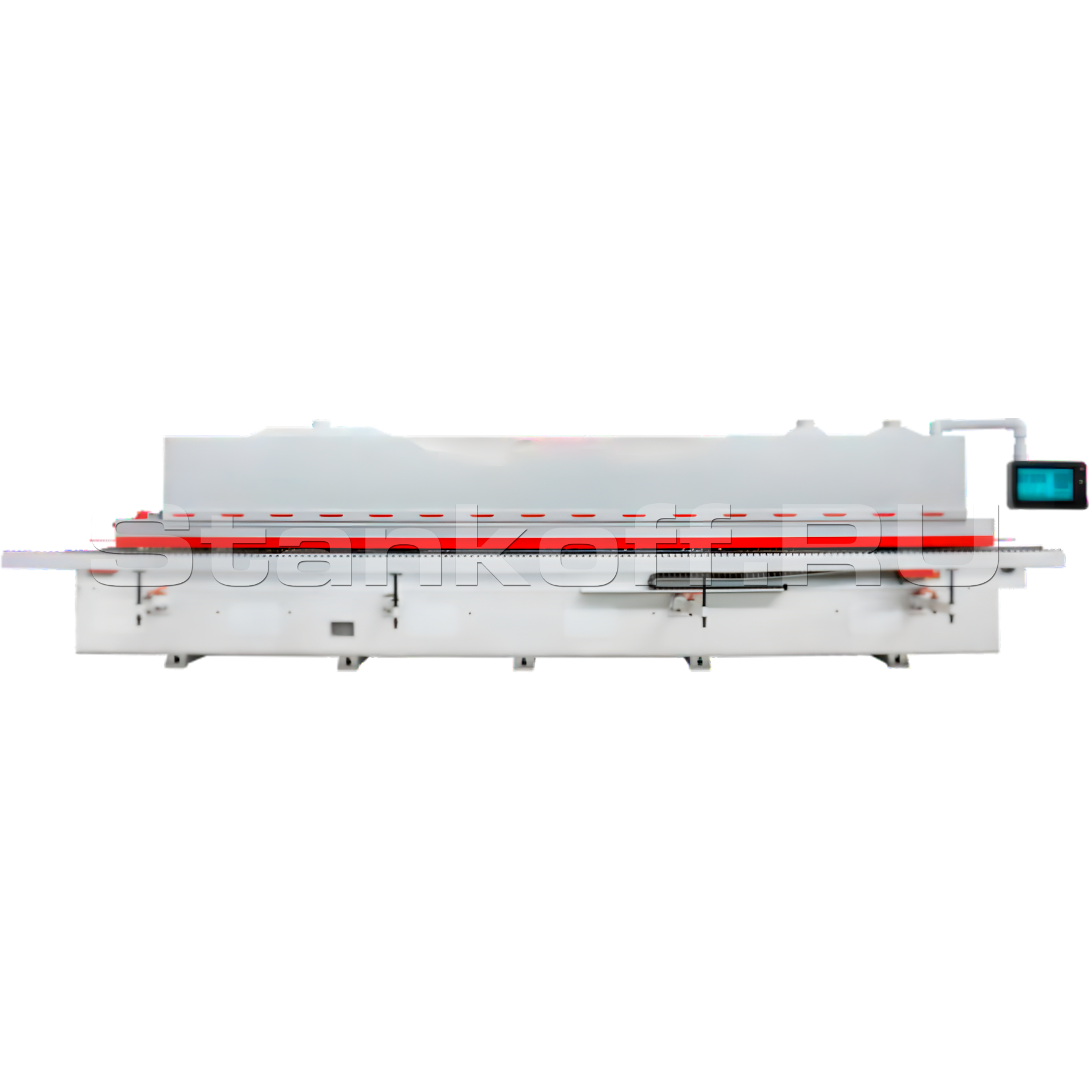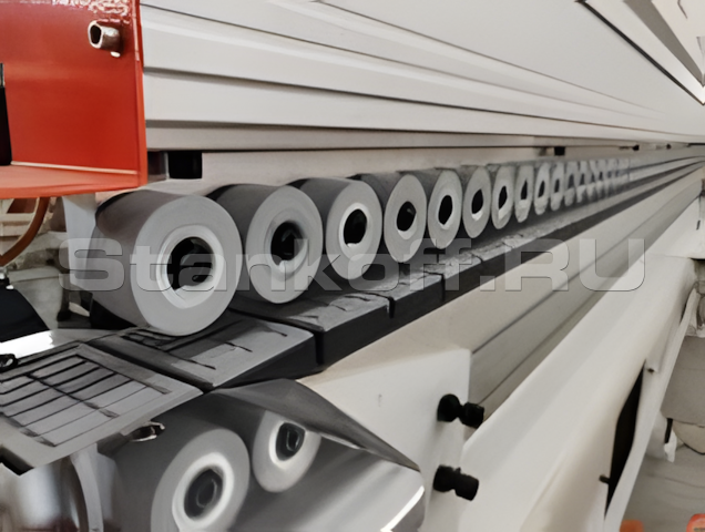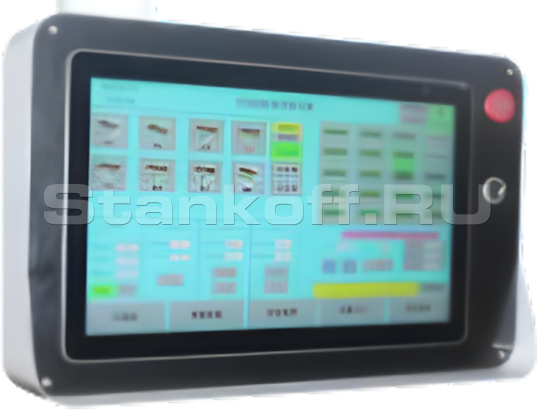 Станок оснащён 21,5-дюймовым сенсорным экраном, обеспечивающим централизованный контроль параметров работы станка. Через интерфейс оператор выполняет выбор функций, толщины панели и технологического профиля, а также задаёт температурные режимы. Дополнительно предусмотрена настройка высоты нажимной балки для точной адаптации под обрабатываемый материал.Конвейер с прижимной балкой