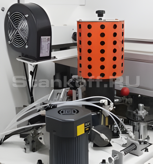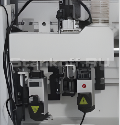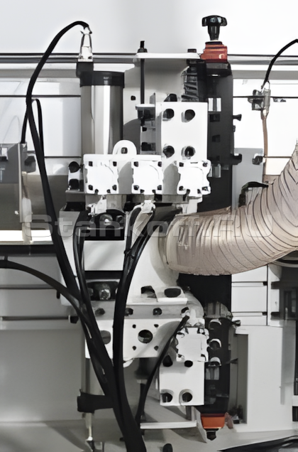 Фрезерный узел предназначен для чистовой обработки кромочной ленты после приклеивания. Обеспечивает удаление верхних и нижних свесов кромки с формированием радиусного профиля (R) и обработку кромочной ленты в одной плоскости с поверхностями плиты. Узел имеет регулировку по продольной, поперечной и вертикальной осям для точной настройки под параметры заготовки и кромки.Узел радиусной циклевки
