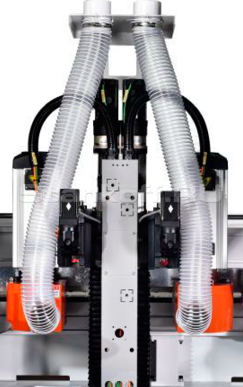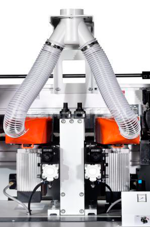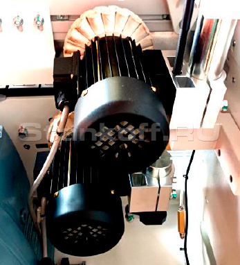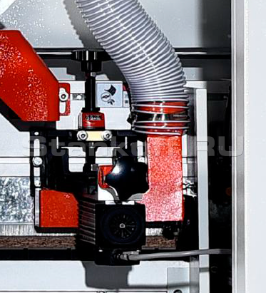 Используются два высокочастотных двигателя мощностью по 2,2 кВт, обеспечивающих чистовое фрезерование. Это позволяет эффективно устранить сколы, снизить выраженность клеевого шва и добиться более аккуратного и эстетичного качества кромкооблицовки.Фрезерный узел для снятия свесов
