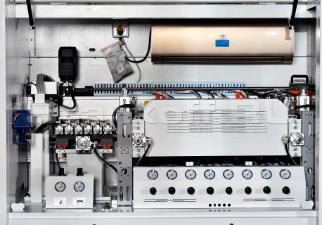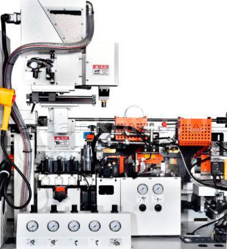 Клей автоматически подаётся из системы забора в узел быстрого предварительного расплава, после чего через него поступает в клеевой бак. Преимущество верхнего расположения клеевого бака — отсутствие карбонизации клея, более стабильная работа узла и минимальная клеевая линия, что повышает качество кромкооблицовки.Пресс-группа