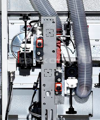 Торцовочный узел оснащён двумя двигателями — для передней и задней торцовки, предназначенными для выравнивания торцов кромочного материала. Узел использует специальные пильные диски, обеспечивающие более ровную и чистую поверхность реза.Черновая обработка кромки