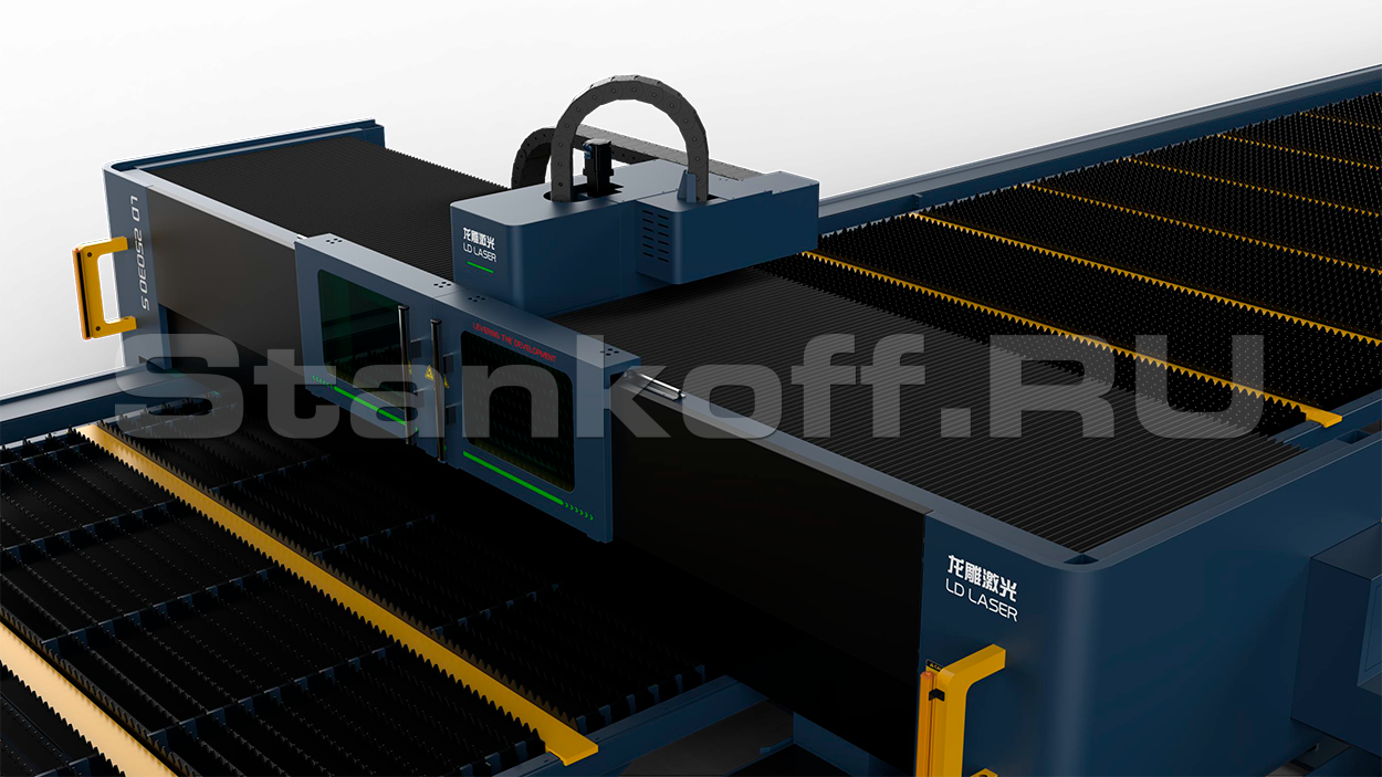 Портал находится внутри закрытой кабины, обеспечивая защиту оператора от лазерного излучения и продуктов горения, обеспечивая безопасность производства.Лазерные датчики для защиты персонала