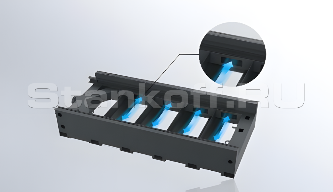 Изготовлена методом сварки из высококачественных стальных листов и профильных труб. После сварки станина проходит снятие внутренних напряжений методом отжига, вторичное старение и высокоточную обработку на крупногабаритном портальном фрезерном оборудовании, что обеспечивает высокую конструктивную жёсткость, устойчивость к вибрациям и возможность работы с повышенными ускорениями.Зональная система дымоудаления
