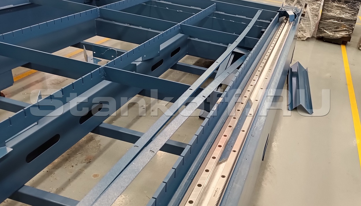 Самостоятельное производство станины позволяет заводу контролировать качество на каждом этапе, делая их станки редкостью на рынке по надёжности и стабильности. Станина выполнена из высококачественной листовой стали и проходит высокотемпературный отжиг, повышающий её прочность, твердость и износостойкость. В отличие от трубчатых конструкций, листовая станина более жёсткая, устойчивая к вибрациям и обеспечивает точный и стабильный рез. Для повышения прочности и минимизации деформаций корпус усилен ребрами жёсткости и дополнительными перекладинами. Все элементы проходят полный цикл обработки на заводе: сварку, термообработку для снятия внутренних напряжений и покраску.Стальной портал