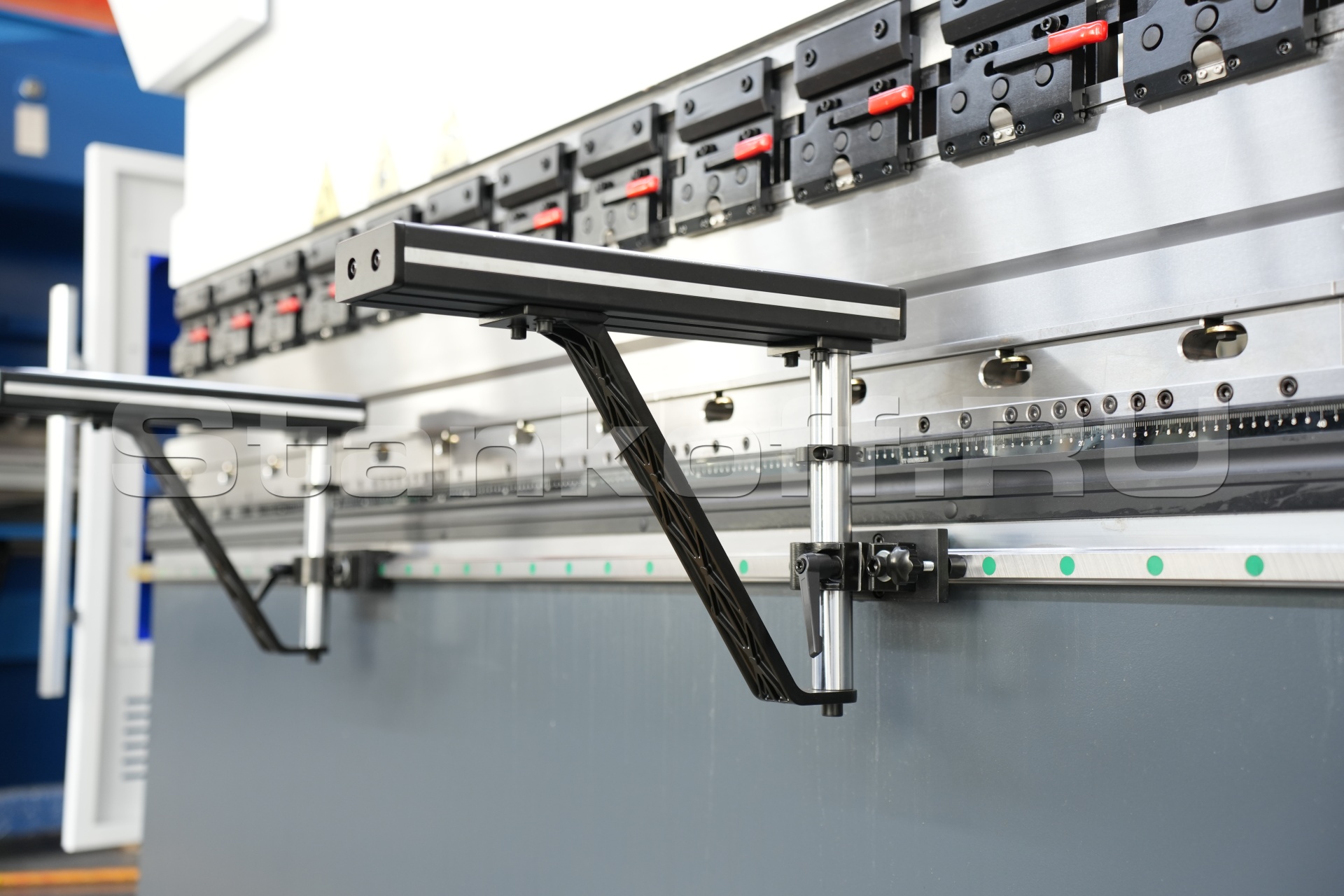Предотвращает контакт гибочного инструмента с руками оператора при работе на высоких скоростях гибки. Если рука оператора оказывается в зоне гиба, то система немедленно реагирует и останавливает движение пуансона вниз, обеспечивая безопасность оператора.Дополнительный задний упор