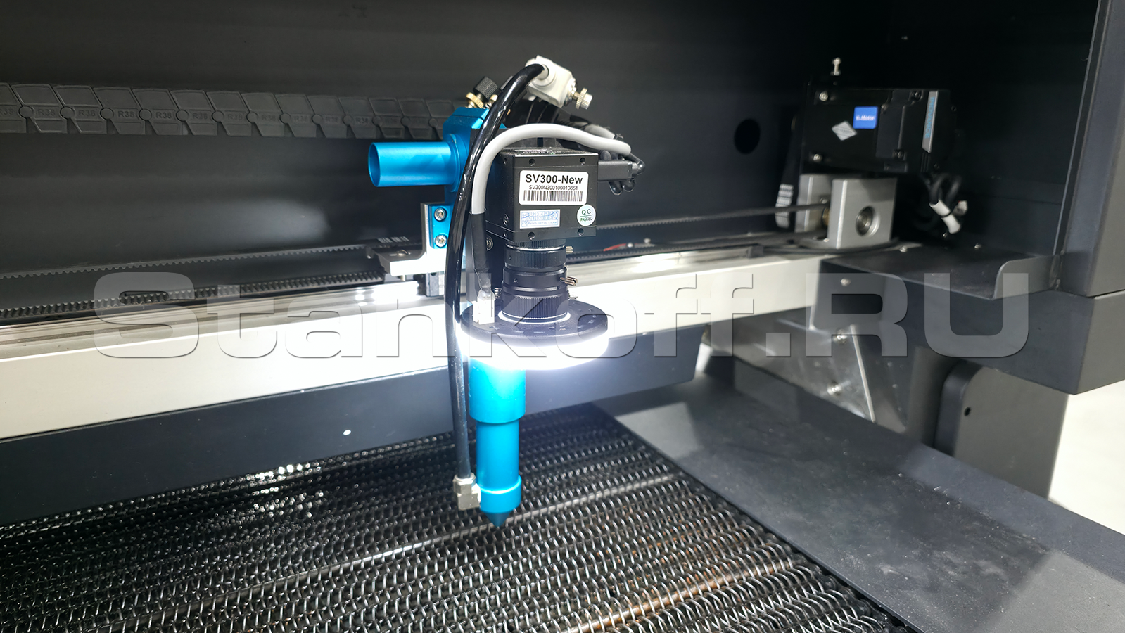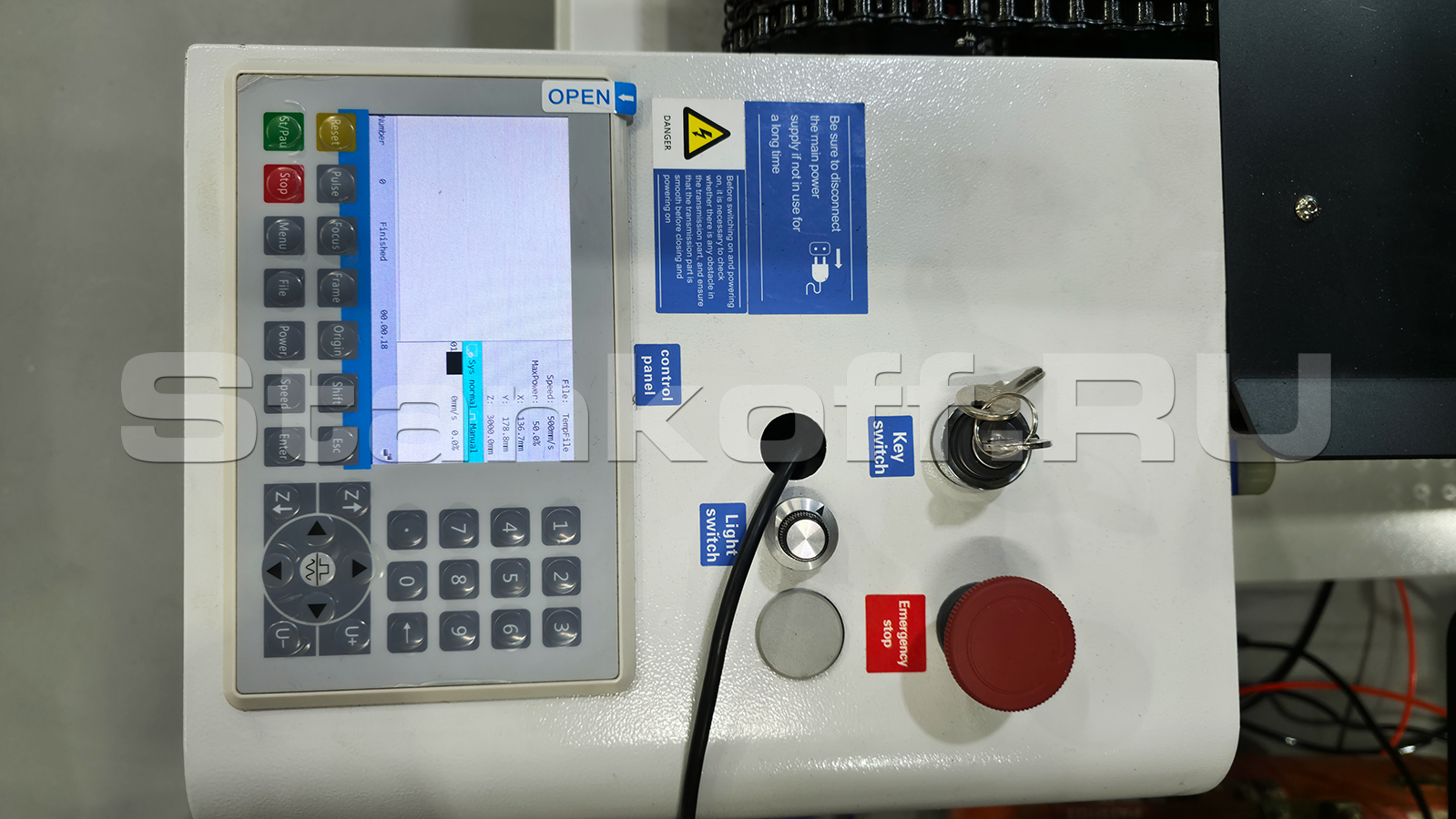 Панель с ЖК Делает работу на станке простой и удобной. Управление осуществляется не посредственно на станке.Лазерная голова с красным лучем-указателем