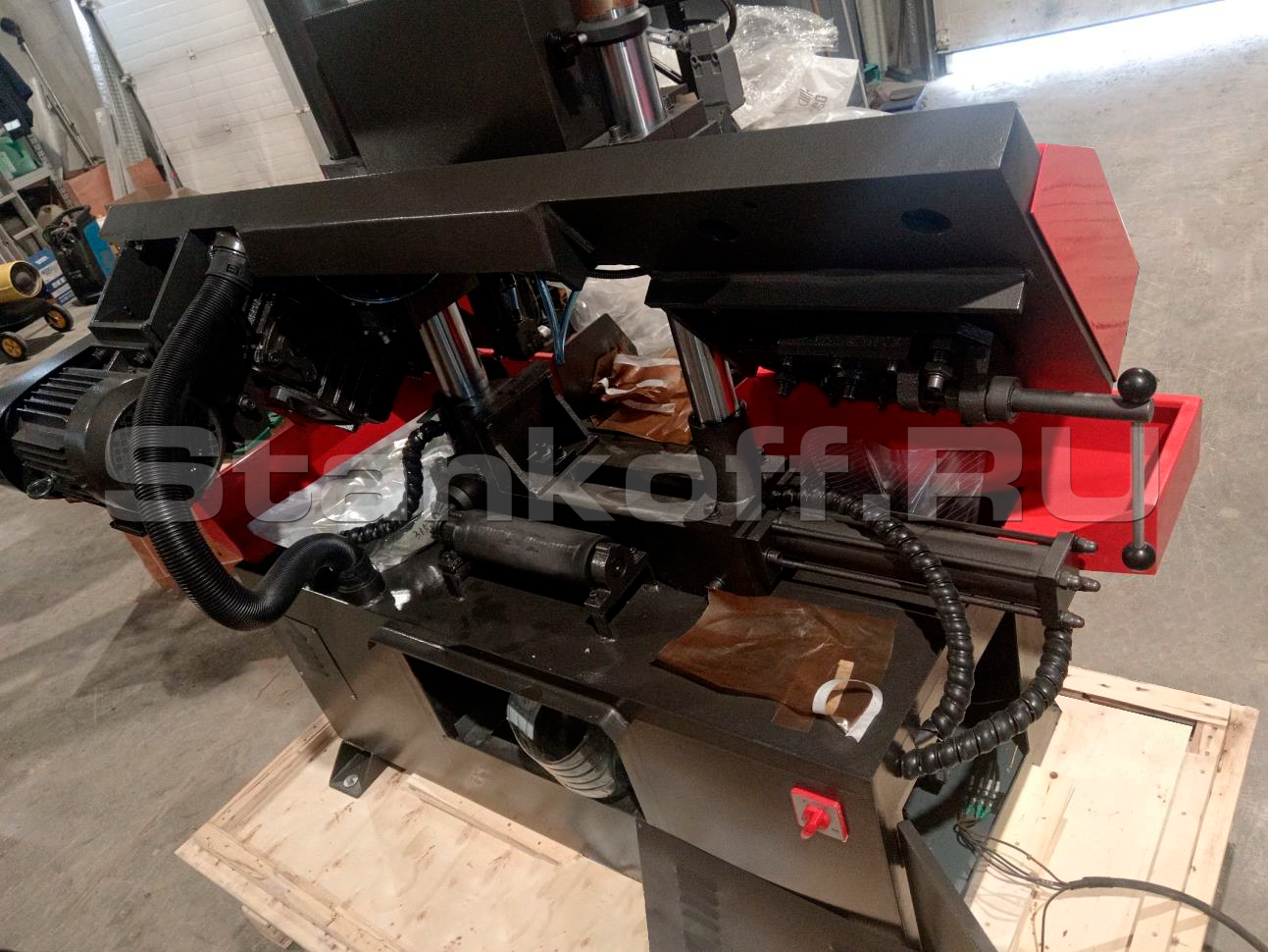 Станок оснащен ленточным полотном размером 3152x27x0,9 мм, главным двигателем мощностью 2,2 кВт и поддерживает 3 скорости движения полотна: 40 / 60 / 80 м/мин, что позволяет подобрать режим обработки под разные задачи. Надежную работу оборудования обеспечивают червячный редуктор главного привода, ручное натяжение полотна, система СОЖ, твердосплавные направляющие и прочное основание с допустимой нагрузкой на стол до 1000 кг.