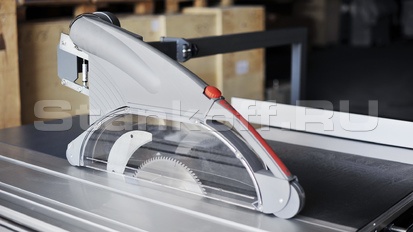 Большой аспирационный кожух удобно регулируется по высоте газлифтами. Обеспечивает безопасную работу на станке и качественное пылеудаление из зоны раскроя даже при пилении под углом. Поворотная штанга крепления защиты пилы с фиксатором рабочего положения.Упор для угловых резов
