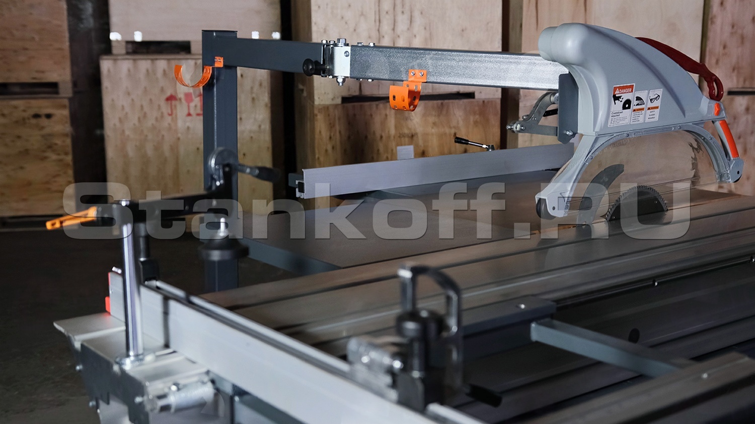 Пильный узел установлен в жестком литом корпусе, который снижает вибрации и обеспечивает стабильную и точную работу станка. Основная и подрезная пилы оснащены отдельными приводами от независимых электродвигателей, что повышает надежность работы и снижает риск перегрузок. Попутное вращение подрезной пилы относительно подачи заготовки обеспечивает предварительный рез и позволяет раскраивать ламинированные плиты без сколов. Электрическая регулировка вылета основной пилы выполняется по направляющим с линейными подшипниками.Эксцентриковый прижим