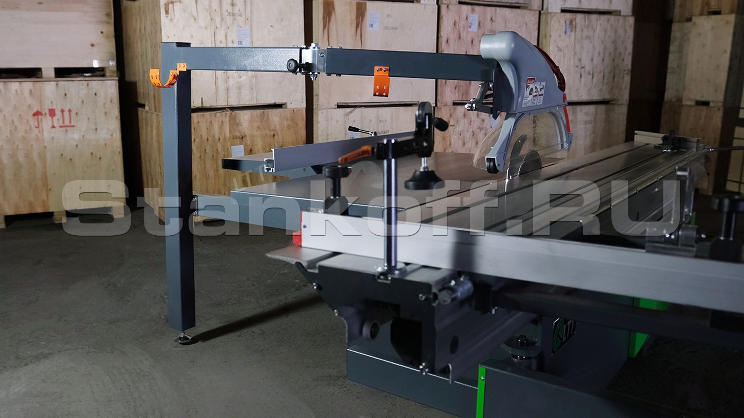 Большой аспирационный кожух удобно регулируется по высоте газлифтами. Обеспечивает безопасную работу на станке и качественное пылеудаление из зоны раскроя даже при пилении под углом. Поворотная штанга крепления защиты пилы с фиксатором рабочего положения.Упор для угловых резов