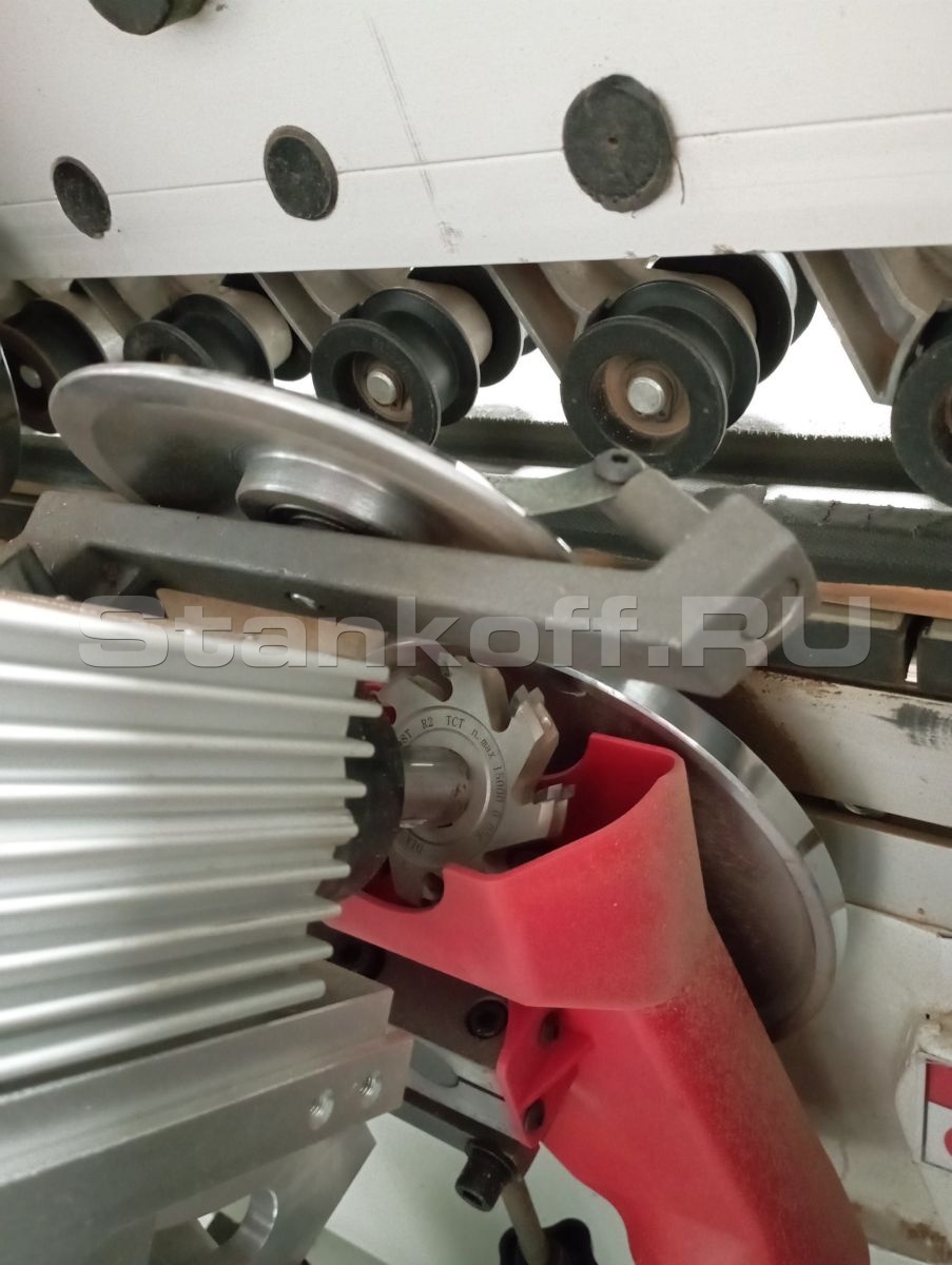 Узел предназначен для продольного формирования радиуса на кромке заготовки с радиусом R3 и менее. Конструкция включает два высокоскоростных двигателя: первый выполняет обработку верхней части кромки, второй — нижней.Торцевой фрезерный узел