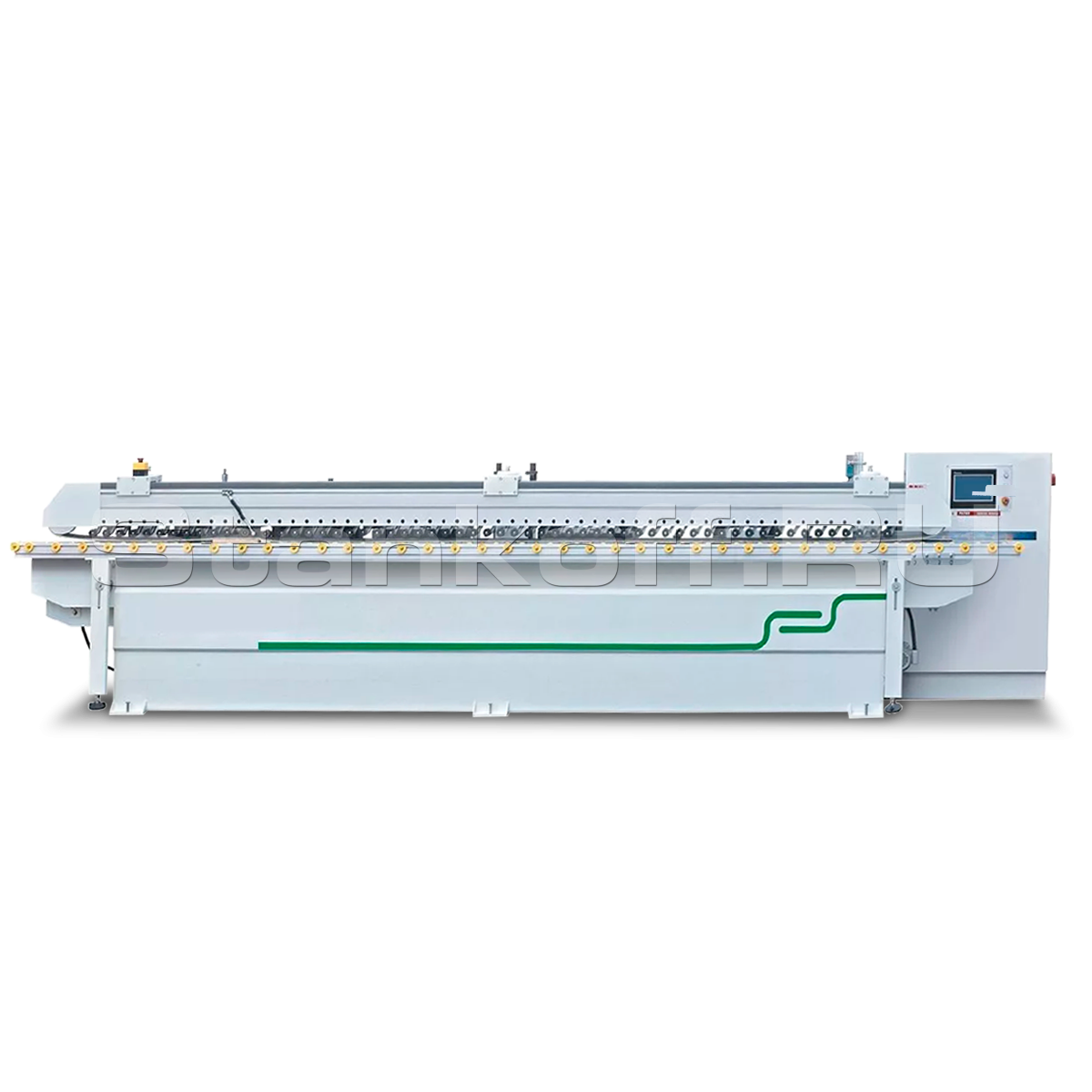 Узел предназначен для формирования радиуса на торцевой части заготовки с радиусом R3 и менее. Оснащён двумя высокоскоростными двигателями с антискольной функцией: первый обрабатывает кромку сверху вниз до середины, второй — снизу вверх. Такая схема обработки снижает риск образования сколов с обеих сторон заготовки.Щлифовальные ленты