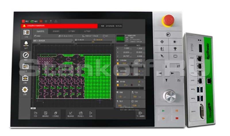 Управление станком осуществляется оператором через операторскую панель, в состав которой входит промышленный ЖК-дисплей с защитой от пыли, элементы управления, расположенные на лицевой панели для удобства работы, а также клавиатура и компьютерная мышь.
