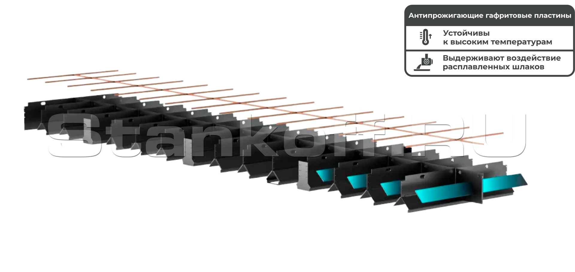 Станина покрыта графитовыми пластинами, устойчивыми к высоким температурам и расплавленному шлаку, которые также блокируют проникновение лазера. Это защищает платформу и станину от повреждений, значительно продлевая срок службы станка.Зональное дымоудаление